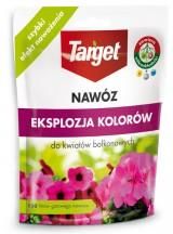 TARGET NAWÓZ DO KWIATÓW BALKONOWYCH - EKSPLOZJA KOLORÓW - 150G - WYSTARCZA NA 300 L ROZTWORU Idealnie skomponowany nawóz wieloskładnikowy zawierający mieszankę składników pokarmowych takich jak azot, fosfor i potas oraz mikroskładników: boru, miedzi, żelaza, manganu i cynku. Optymalny skład powoduje, że rośliny otrzymują tylko potrzebną i wystarczająca ilość składników pokarmowych. Dobrze odżywione rośliny są odporniejsze na działanie szkodników czy chorób. Nawóz powoduje szybszy wzrost zasilanych roślin. Bardzo szybko jest przyswajany przez rośliny i szybko uzupełnia niedobory składników pokarmowych. Zapewnia bujne kwitnienie oraz zapewnia intensywne wybarwienie wszystkich gatunków kwiatów. Przeznaczony jest przede wszystkim dla roślin o dużych wymaganiach pokarmowych takich jak surfinia i pelargonia. Dawkowanie Nawozu rozpuszczalnego do kwiatów balkonowych W zależności od kondycji roślin rozpuścić od 5 do 15 g nawozu w 5 l wody. Sposób użycia: Odmierzyć zalecaną dawkę przy użyciu łyżeczki. Rozpuścić nawóz w odpowiedniej ilości wody. Dokładnie wymieszać. Podlać roślinę tak, aby nie zmoczyć liści.