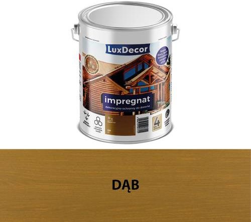LUXDECOR IMPREGNAT OCHRONNO DEKORACYJNA DO DREWNA Pojemność: 9L Kolor: DĄB LuxDecor jest profesjonalnym środkiem dekoracyjno-impregnującym do drewna i materiałów drewnopochodnych. Poprzez odcięcie dopływu wody produkt przeciwdziała rozwojowi pleśni i grzybów, zapobiega butwieniu i zwiększa żywotność drewna. Produkt jest przeznaczony do malowania fasad budynków mineralnych i gospodarczych, filarów, belek, balustrad, pergoli, płotów, drewnianych elementów ogrodowych oraz innych. Impregnat można stosować także wewnątrz pomieszczeń, np. do mebli lub półek drewnianych. Impregnat pozostawia częściowo widoczny rysunek drewna, przy nanoszeniu większej ilości powłok lub przy grubszej warstwie powłoki rysunek drewna ulega zakryciu. Preparat tworzy powłokę matową. DANE TECHNICZNE Wydajność: do 20m2/l przy malowaniu jedną warstwą (zależy od rodzaju, gatunku i chłonności drewna) Ilość warstw: 1 - 2 Nanoszenie drugiej warstwy: ok. 1-2 h (po wyschnięciu pierwszej) Czas schnięcia dotykowy: ok. 1 h Całkowity czas schnięcia: 12 h (zależy od rodzaju i chłonności drewna oraz od warunków atmosferycznych) Aplikacja: pędzel, wałek Postać: półpłynna do galaretowatej Mycie narzędzi: woda z detergentem Rozcieńczalnik: woda . Środek impregnujący LuxDecor gwarantuje trwałość barwy i powłoki ze względu na wysoki stopień penetracji. Produkt zawiera szlachetne woski, dzięki którym pokryta powierzchnia nie chłonie wody. Zawarte w nim pigmenty są odporne na działanie promieni UV. Środek nadaje się do pielęgnacji, zabezpieczania i barwienia wszystkich rodzajów drewna oraz materiałów drewnopodobnych. Produkt charakteryzuje się bardzo wysoką trwałością kolorów oraz odpornością na działanie czynników atmosferycznych. Kolor produktu w opakowaniu różni się od koloru na wzorniku. Właściwą barwę uzyskuje się dopiero po aplikacji, po całkowitym wyschnięciu impregnowanej powierzchni. UWAGA Prezentowane barwy należy traktować jedynie poglądowo, gdyż na ocenę koloru wpływ mają np. ustawienia monitora (wyświetlacza, jasność/kontrast/temperatura barw), oświetlenie zewnętrzne. Produkt posiada półpłynną, galaretowatą konsystencję. Jest to jego naturalna cecha i nie oznacza utraty właściwości. Finalny kolor zależy od wielu czynników, takich jak jakość i gatunek drewna, rodzaj obróbki jego powierzchni oraz ilości naniesionych warstw preparatu. Przed użyciem produkt należy dokładnie wymieszać w celu uzyskania jednorodnej konsystencji oraz barwy w całej objętości opakowania. Przed impregnowaniem właściwej powierzchni, zaleca się dokonanie próby w niewidocznym miejscu w celu zapoznania się z produktem. W celu zachowania jednolitego koloru należy stosować opakowania produktu o tym samym numerze partii. W innym przypadku zawartość wszystkich opakowań należy połączyć i przemieszać ze sobą, w celu uzyskania jednolitego odcienia. PRZYGOTOWANIE PODŁOŻA Powierzchnię przeznaczoną do malowania należy oczyścić i w razie potrzeby odtłuścić, usunąć pył, kurz i zabrudzenia. Stare powłoki farb i lakierów należy usunąć. W przypadku powłok żywicznych należy je oczyścić rozpuszczalnikiem uniwersalnym. Drewno powinno być suche (wilgotność nie powinna przekraczać 15%). W przypadku drewna o większej wilgotności lub narażonego na opady atmosferyczne zaleca się stosowanie bezbarwnych impregnatów grzybobójczych, w celu dodatkowej ochrony, i jako drugą warstwę (po wyschnięciu) zastosowanie impregnatu akrylowego dekoracyjno-ochronnego LuxDecor. SPOSÓB UŻYCIA LuxDecor stosuje się w postaci nierozcieńczonej. Malowanie należy przeprowadzać w temperaturze powyżej 6°C. Wilgotność drewna powinna wynosić poniżej 15%. Przed użyciem produkt należy dokładnie wymieszać. Produkt nie wymaga rozcieńczania, w razie uzasadnionej potrzeby może być rozcieńczony wodą (do 10% wody). Preparat nanosić za pomocą pędzla lub wałka, starając się równomiernie rozprowadzać go na powierzchni. Zaleca się nakładanie dwóch warstw preparatu. Nanoszenie drugiej warstwy następuje bezpośrednio po wyschnięcie pierwszej. Należy stosować ubranie robocze, gdyż zabrudzenia powstałe przy pracy są trudne do usunięcia. Wydajność produktu zależy od typu i chłonności podłoża. Przed przystąpieniem do dekoracji głównej powierzchni należy wykonać próbę wymalowania. Poszczególne partie produktu mogą nieznacznie różnić się odcieniem koloru. Zalecamy użycie produktów z jednej partii produkcyjnej do wykonania całej pracy. W innym przypadku zawartość wszystkich opakowań należy połączyć i przemieszać ze sobą w celu uzyskania jednolitego odcienia. Finalny kolor zależy od wielu czynników, między innymi od jakości i gatunku drewna, rodzaju obróbki jego powierzchni, ilości naniesionych warstw. Narzędzia zaraz po pracy należy umyć wodą z detergentem. Produkt zgodny z przepisami prawa UE. Szczegółowe informacje o produkcie w karcie charakterystyki (SDS) dostępnej w załączniku oferty. Wyrób niepalny. W czasie prac stosować podstawowe zasady BHP. Szczegółowe informacje o zagrożeniach dostępne w Karcie Charakterystyki do załączonej oferty. Karta techniczna dołączona do oferty produktu. Piktogram i hasło ostrzegawcze: Nie ma. Komponenty niebezpieczne umieszczone na etykiecie: Nie ma.
