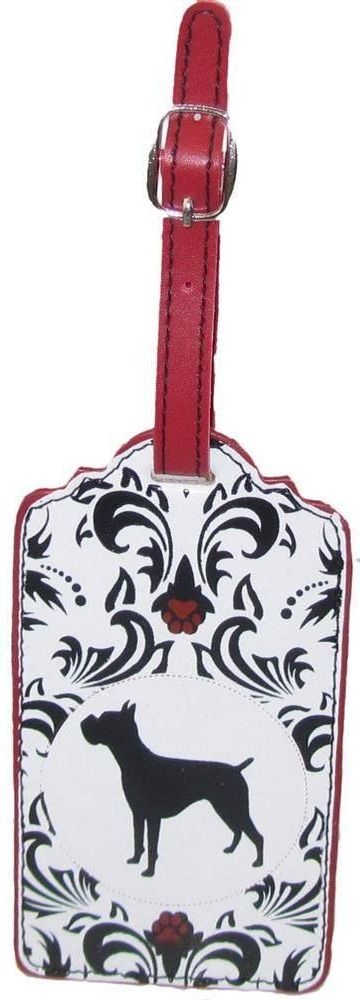 Czerwono - czarna zawieszka na bagaż z psem, na pasku z klamerką. Z tyłu, w kieszkonce, tabelka z możliwością wpisania danych adresowych. Wymiary: 13X7CM
