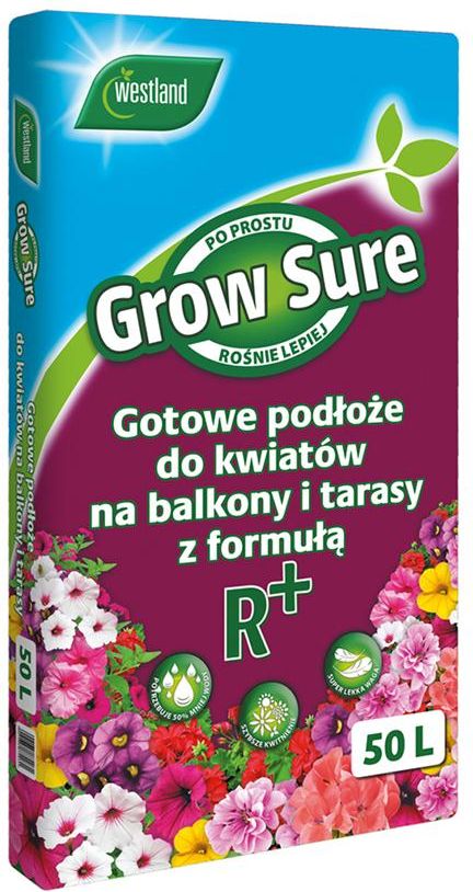 Westland Ziemia Podłoże do Kwiatów Balkonowych i Tarasowych z Formułą R+ 50L ZE WZGLĘDU NA GABARYT W JEDNYM ZAMÓWIENIU MOŻNA KUPIĆ MAX 2 SZTUKI Idealne do uprawy roślin ozdobnych w ograniczonej ilości podłoża – skrzynki, doniczki, pojemniki. Unikalna formuła długo utrzymuje właściwy poziom wilgotności, zapewniając jednocześnie odpowiednią cyrkulację powietrza. Podłoże zawiera nawóz odżywiający rośliny przez pierwsze 6 tygodni od posadzenia. Wyjątkowo lekka formuła czyni to podłoże idealnym do stosowania w uprawach balkonowych, tarasowych i dachowych. Lekka, porowata struktura – lepsze warunki dla rozwoju korzeni, co daje doskonałe efekty w uprawie. długo utrzymuje wilgoć – mniej podlewania szybko i łatwo chłonie wodę oraz odprowadza jej nadmiar – łatwe w podlewaniu stabilne i długotrwałe nawożenie – do 6 tygodni od pierwszego podlania lżejsze od tradycyjnych podłoży nawet o 50% – wygoda w przenoszeniu