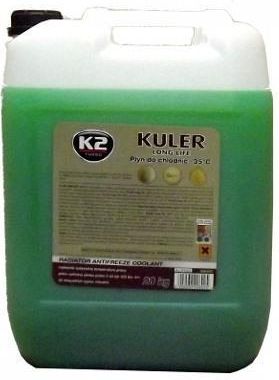 K2 Kuler koncentrat płynu do chłodnic samochodowych Zielony 20kg Zielony koncentrat płynu do chłodnic -35°CK2 Kuler Long Life Nowoczesny i uniwersalny gotowy płyn do chłodnic o bardzo wysokich parametrach użytkowych. Specjalnie opracowana receptura latem chroni silnik przed przegrzaniem, a zimą przed zamarzaniem. Pakiet inhibitorów złożony z kwasów karboksylowych z dodatkiem specjalnych inhibitorów korozji i środków antypiennych zabezpiecza silnik. Zapewnia pełną ochronę silnika przez 5 lat bez limitu kilometrów, nawet także gdy mieszamy go z innymi płynami o przedłużonej żywotności. Właściwości może być stosowany we wszystkich rodzajach chłodnic, zwłaszcza aluminiowych mieszany z innymi płynami równie wysokiej jakości, niezależnie od koloru spełnia rygorystyczne normy amerykańskie ASTM D 3306 i ASTM D 2570 najwyższą jakość płynu potwierdza Certyfikat Zgodności wg normy PN-C-40007 wydany przez Instytut Transportu Samochodowego w Warszawie Temperatura zamarzania -35°C : rozcieńczyć płyn w stosunku 1:1 Temperatura zamarzania -50°C : na 0,5 litra wody użyć 1 litr koncentratu Kuler. Opakowanie : 20kg