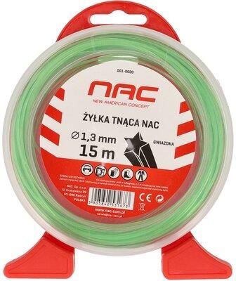Żyłka tnąca NAC o przekroju gwiazdkowym, średnica 1,3 mm, długość 15 m, kolor zielony. Idealna do pracy z podkaszarkami i kosami.