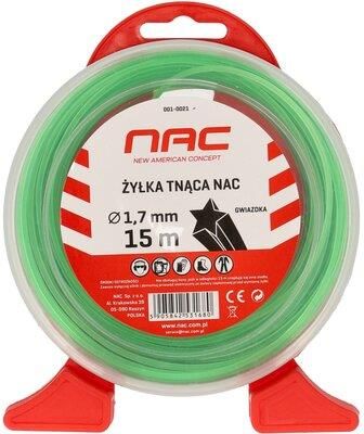 Żyłka tnąca NAC o przekroju gwiazdkowym, średnica 1,7 mm, długość 15 m, kolor zielony. Idealna do pracy z podkaszarkami i kosami.