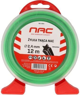 Żyłka tnąca NAC o przekroju gwiazdkowym, średnica 2,4 mm, długość 12 m, kolor zielony. Idealna do pracy z podkaszarkami i kosami.
