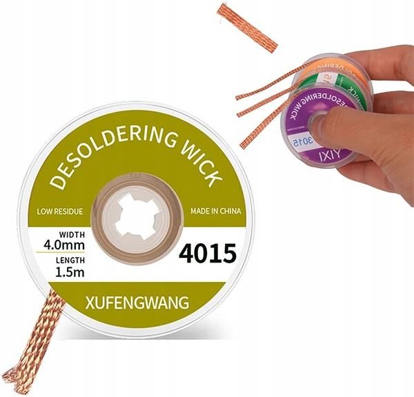 Taśma / plecionka rozlutownicza 4mm x 1,5m ✅ Plecionka do usuwania cyny: To plecionka o splotach z drobnych drucików, służąca do usuwania cyny z punktów lutowniczych przez metodę adhezji. ✅ Niezbędna w serwisach elektronicznych: Jest niezbędna podczas wszelkich napraw w serwisach elektronicznych do precyzyjnego usuwania cyny. ✅ Warstwa kalafonii (topnik): Plecionka jest pokryta warstwą krystalicznej kalafonii (topnika), skracając czas wchłaniania cyny i zapewniając ochronę przed przegrzaniem elementu. ✳️ Specyfikacja: ✔️ Materiał: miedź ✔️ Rozmiar: 4mm ✔️ Długość: 1,5m ✳️ W zestawie: ✔️ 1szt - rolka o długości 150cm ✅ Skutecznie usuwaj cynę: Ta taśma rozlutownicza, znana również jako plecionka lutownicza, umożliwia efektywne usunięcie spoiwa lutowniczego z układów PCB i BGA podczas procesu lutowania. ✅ Gęsty splot: Dzięki gęstemu splotowi, taśma jest skuteczna i ułatwia usuwanie cyny z punktów lutowniczych przez adhezję, czyli połączenie z układem lutowniczym.