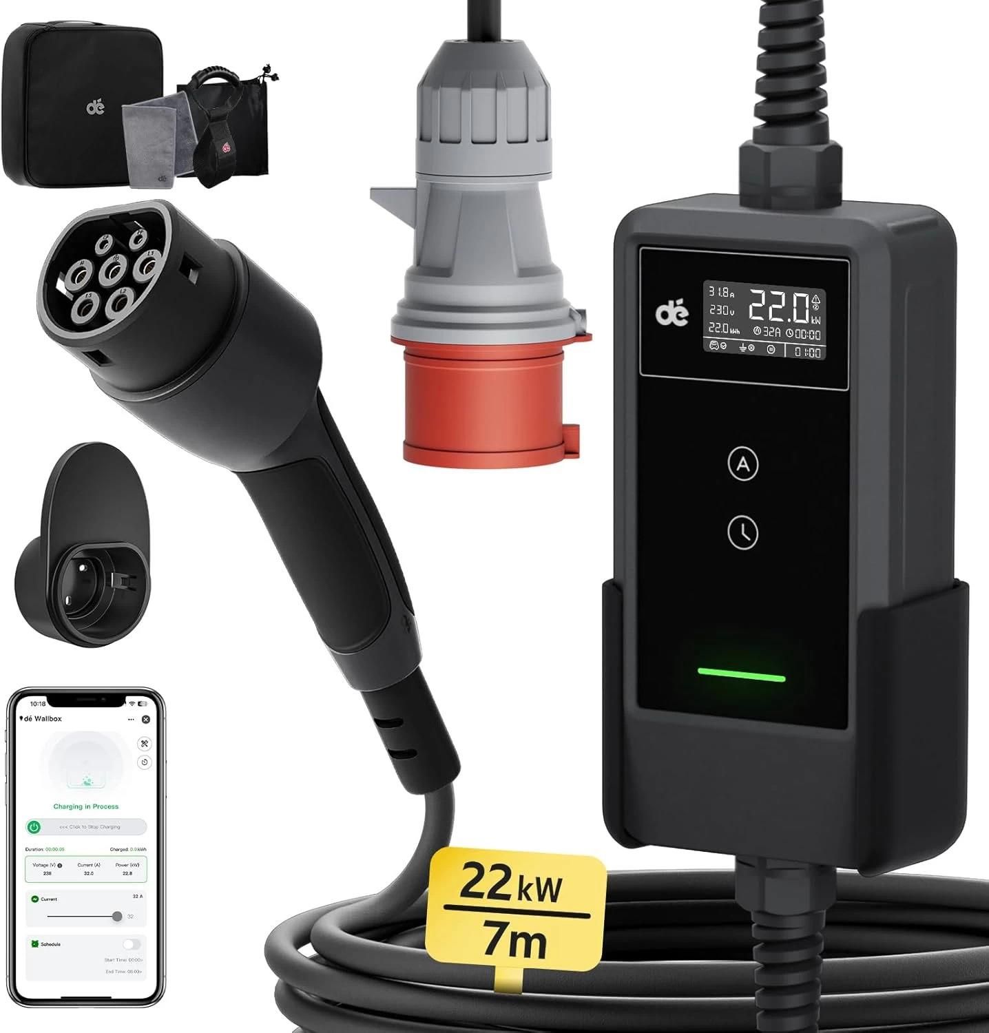 Przenośny wallbox EV dé Typ 2 CEE 22kW – szybkie i bezpieczne ładowanie w każdych warunkach Przenośna ładowarka dé Typ 2 CEE 22kW to idealne rozwiązanie dla właścicieli pojazdów elektrycznych poszukujących niezawodnego i efektywnego sposobu ładowania zarówno w domu, jak i w podróży. Dzięki trójfazowemu złączu CEE 32A oraz kompatybilności z większością pojazdów elektrycznych wyposażonych w gniazdo Typ 2, ładowarka oferuje szybkie ładowanie z mocą do 22 kW. Bezpieczeństwo i wygoda użytkowania Ładowarka dé Typ 2 CEE 22kW została zaprojektowana z myślą o maksymalnym bezpieczeństwie użytkownika. Wyposażona jest w zaawansowane systemy ochrony przed przegrzaniem, przepięciami, przeciążeniem oraz zwarciem. Intuicyjny wyświetlacz LCD informuje o aktualnym stanie ładowania, a ergonomiczny uchwyt zapewnia komfort podczas podłączania i odłączania urządzenia. Najważniejsze cechy Wysoka moc ładowania: do 22 kW (32A, 3-fazowe), zapewniająca szybkie i efektywne ładowanie. Regulowany prąd ładowania: możliwość dostosowania natężenia prądu w zakresie 6A–32A, umożliwiająca optymalne dopasowanie do różnych instalacji elektrycznych. Wodoodporność i trwałość: klasa szczelności IP55 oraz wytrzymała konstrukcja z materiału TPU zapewniają odporność na warunki atmosferyczne i długą żywotność. Kompatybilność: obsługuje szeroką gamę pojazdów elektrycznych z gniazdem Typ 2, w tym modele takich marek jak Volkswagen, Tesla, BMW, Renault, Hyundai i wiele innych. W zestawie: wieszak obudowy, wieszak kabla z uchwytem wtyczki, praktyczna torba transportowa, paski do organizacji kabla oraz ściereczka z mikrofibry dla łatwego przechowywania i utrzymania czystości. Zakres ustawień prądu: 6A / 10A / 13A / 16A / 20A / 24A / 32A Zakres temperatury pracy: od -25°C do +50°C Stopień ochrony: IP66 (obudowa), IP55 (wtyczka) Dokumentacja Instrukcja użytkownika (m.in. w języku polskim)