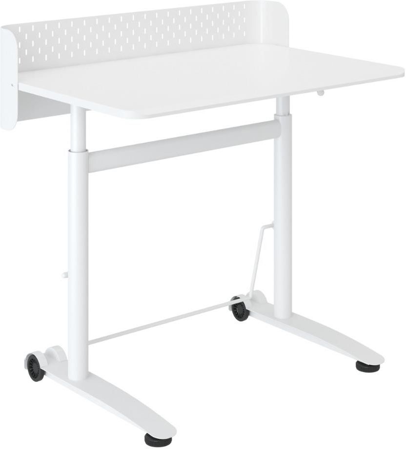 Białe stanowisko robocze z regulacją wysokości 66,7–100,3 cm i blatem 90 × 60 cm. Stabilna konstrukcja ze stali i PP oraz blat z płyty wiórowej zapewniają wygodną przestrzeń do pracy i nauki w domu lub biurze.