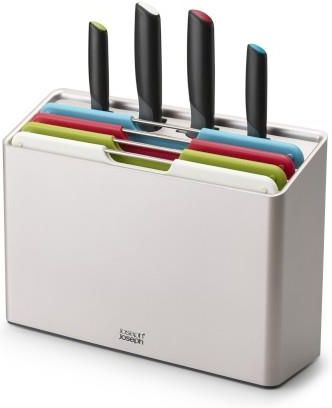 Funkcjonalny i poręczny niezbędnik kuchenny zawierający 4 deski do krojenia oraz 4 noże marki Joseph Joseph. Deski posiadają fakturowaną powierzchnię.