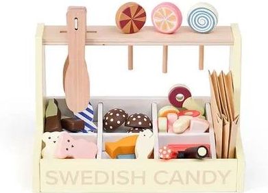Słodka zabawa w szwedzkim stylu Kolorowe żelki, lizaki, praliny i słynna słona lukrecja – wszystko z drewna i wyobraźni. Drewniany sklepik ze słodyczami pozwala dzieciom tworzyć własne cukierkowe historie, zapraszać gości do zabawy i rozwijać swoje umiejętności społeczne oraz manualne. W zestawie …