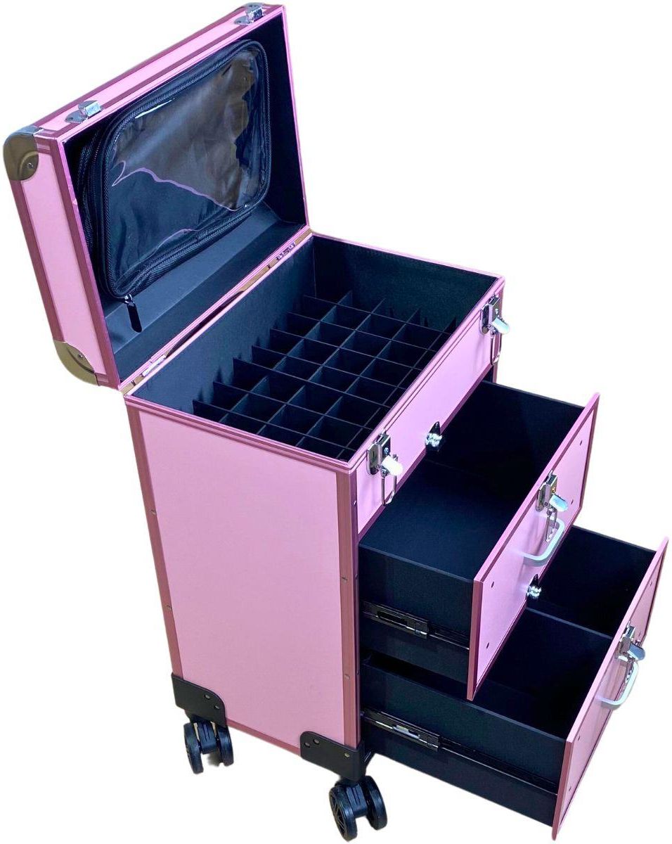 Kuferek fryzjersko-kosmetyczny z 3 szufladami (Kolor: Różowy ) Nasz kuferek fryzjersko-kosmetyczny to niezastąpione rozwiązanie dla profesjonalistów, którzy pragną przechowywać swoje produkty zgodnie z najwyższymi standardami. Wyposażony w trzy szuflady, zapewnia praktyczne i bezpieczne przechowywanie zarówno drobnych przedmiotów, kosmetyków, jak i sprzętu fryzjerskiego czy manicure. Funkcjonalność i organizacja: Górna część z przegródkami: Oferuje wygodną przestrzeń do przechowywania drobnych przedmiotów oraz kosmetyków. Dzięki precyzyjnie zaprojektowanym przegródkom, zachowasz porządek i łatwość dostępu do potrzebnych artykułów. Środkowa szuflada: Dosyć obszerna, umożliwia swobodne przechowywanie różnorodnego sprzętu fryzjerskiego lub manicure. Dzięki tej szufladzie, wszystkie Twoje narzędzia będą zawsze pod ręką. Dolna szuflada: podzielona na połowę zmieści wszytkie niezbędne produkty. Specyfikacje: Wymiary zewnętrzne kuferka: Wysokość: 60 cm Szerokość: 35 cm Głębokość: 20 cm Nasz kuferek zapewni nie tylko doskonałą organizację, ale także ochronę Twoich kosztownych produktów. Z wygodnymi kółkami do przewożenia oraz wysuwaną rączką do przenoszenia, podróżowanie z Twoimi niezbędnymi akcesoriami stanie się prostsze niż kiedykolwiek. Wysoka jakość wykonania i elegancki kolor czarny kuferka dodają profesjonalnego wyglądu i stylu.