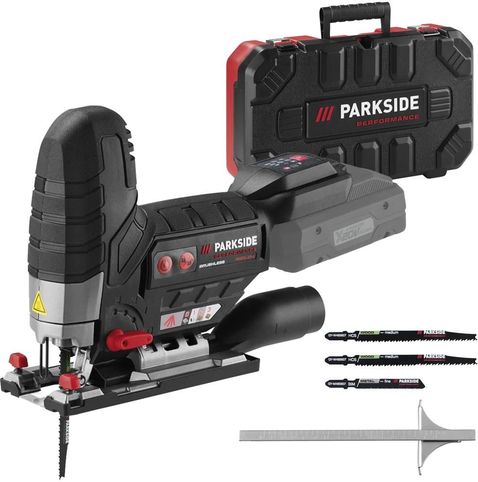 Wyrzynarka Parkside PSSPA 20-Li F4 2x brzeszczoty do drewna 1x brzeszczot do metalu 1x prowadnica równoległa 1x adapter do zewnętrznego odsysania pyłu (wstępnie zamontowany) 1x reduktor (wstępnie zamontowany) Instrukcja obsługi Walizka transportowa