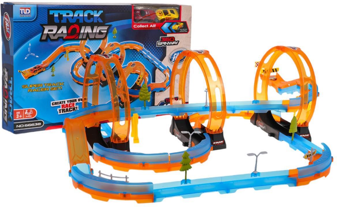 Opis MEGA Tor Wyścigowy 48el. Duży, ekstremalny tor wyścigowy z ostrymi zakrętami, pętlami i dwoma szybkimi autkami w zestawie, to propozycja dla dzieci od 3-go roku życia. Zestaw składa się z 48 elementów do samodzielnego montażu. Na torze znajdują się odcinki proste, ostre zakręty z barierkami zabezpieczającymi przed wypadaniem pojazdu z trasy, a także trzy pętle 360 stopni. Pojazdy posiadają napęd pull back. Wymiary tor ok. 71 cm x 87 cm x 23 cm, autko ok. 7 cm x 3 cm x 3,5 cm, plastikowe drzewka ok. 6,5 cm x 3 cm, opakowanie ok. 52 cm x 31,3 cm x 7 cm. Zawartość zestawu elementy konstrukcyjne toru, 2 x samochodzik, naklejki dekoracyjne, plastikowe drzewka