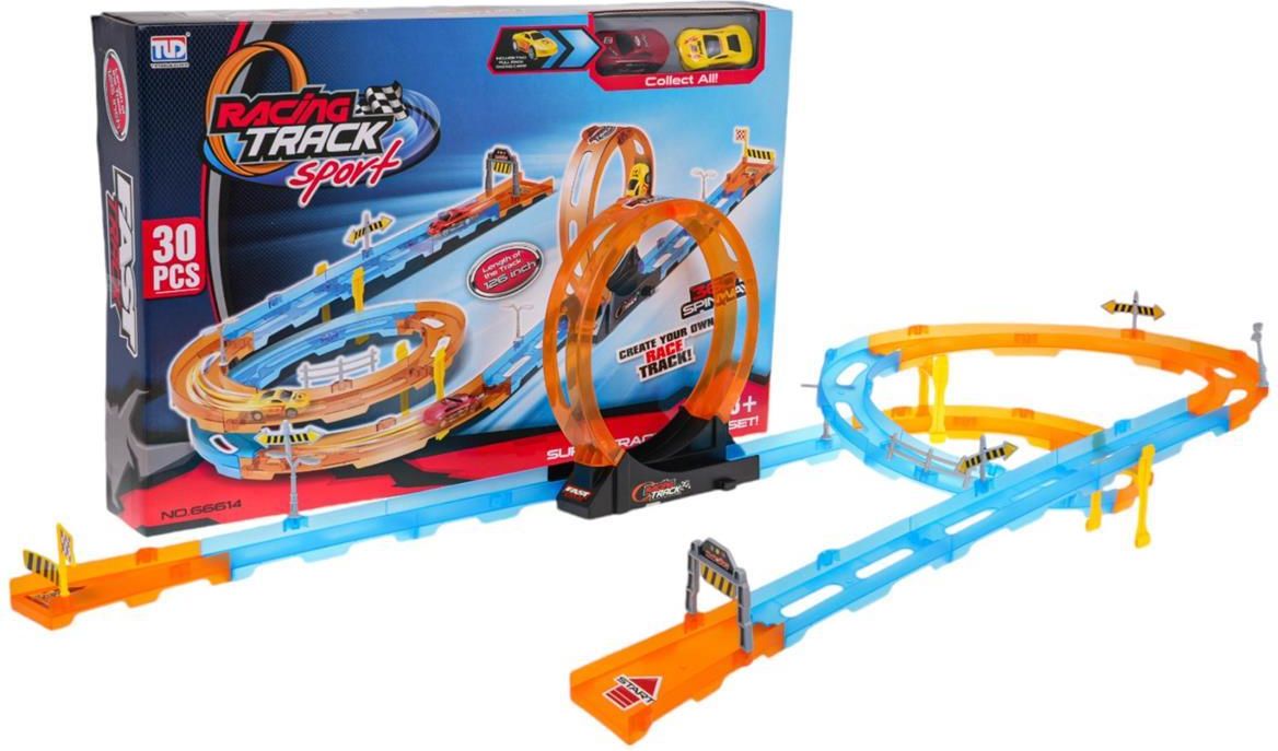 Opis Tor Wyścigowy 30el. Duży, ekstremalny tor wyścigowy z ostrymi zakrętami, pętlami i dwoma autkami w zestawie, to propozycja dla dzieci od 3-go roku życia. Zestaw składa się z 30 elementów do samodzielnego montażu. Na torze znajdują się odcinki proste, ostre zakręty z barierkami zabezpieczającymi przed wypadaniem pojazdu z trasy, dwa poziomy, a także pętla 360 stopni. Pojazdy znajdujące się w zestawie posiadają napęd pull back. Wymiary tor ok. 92 cm x 36 cm x 23 cm, autko ok. 7 cm x 3,5 cm x 3 cm, opakowanie ok. 55,3 cm x 36,5 cm x 7 cm Zawartość zestawu elementy konstrukcyjne toru, 2 x samochodzik, naklejki dekoracyjne.