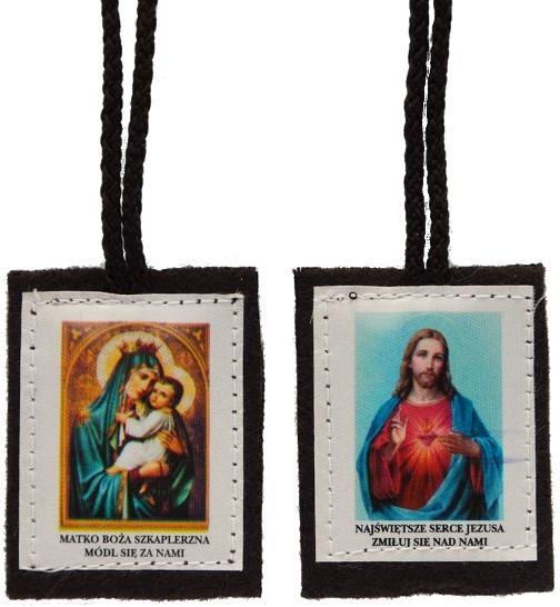 Szkaplerz sukienny Szkaplerz karmelitański składa się z dwóch prostokątnych skrawków wełnianego sukna koloru brunatnego. Celem noszenia szkaplerza karmelitańskiego jest szczególna cześć ku Najświętszej Maryi Pannie dla uproszenia od niej wszechwładnej opieki w życiu, a szczególnie w godzinę śmierci.
