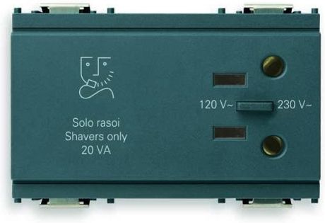 Gniazdo do golarek 230V gniazdo do golarek z transformatorem izolującym 20VA wyjście 2P 15A 125V~ standard amerykański (wtyki płaskie niepolaryzowane) wyjście 230V~ dla eurowtyczek 2P 2,5A zasilanie 120-230V~, 50-60Hz zajmuje 3 moduły dostępne kolory: szary i biały Model. 16290 szary Model. 16290.B …
