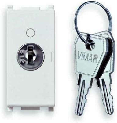 Łącznik jednobiegunowy z kluczykiem 1-modułowy.Łącznik ten jest najpopularniejszym elementem w instalacji elektrycznej do zmiany stanu obwodu. Włączenie obwodu następuje po przemieszczeniu klucza w pozycje '1'. Klucz wyjmowalny jest jedynie w pozycji "O" (OFF).Kolor: biały i silever. Producent: Vimar. Seria: Plana