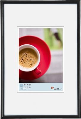 Walther Galeria Black 30x45 Ramka z tworzywa sztucznego o zaokrąglonym profilu z prawdziwym szkłem we wszystkich rozmiarach. Sztaluga o wymiarach do 20x30 cm. Rozmiar profilu: 9,6mm x 19mm do 30x40. Od rozmiaru 40x50 profil ma wymiary 12mmx22mm