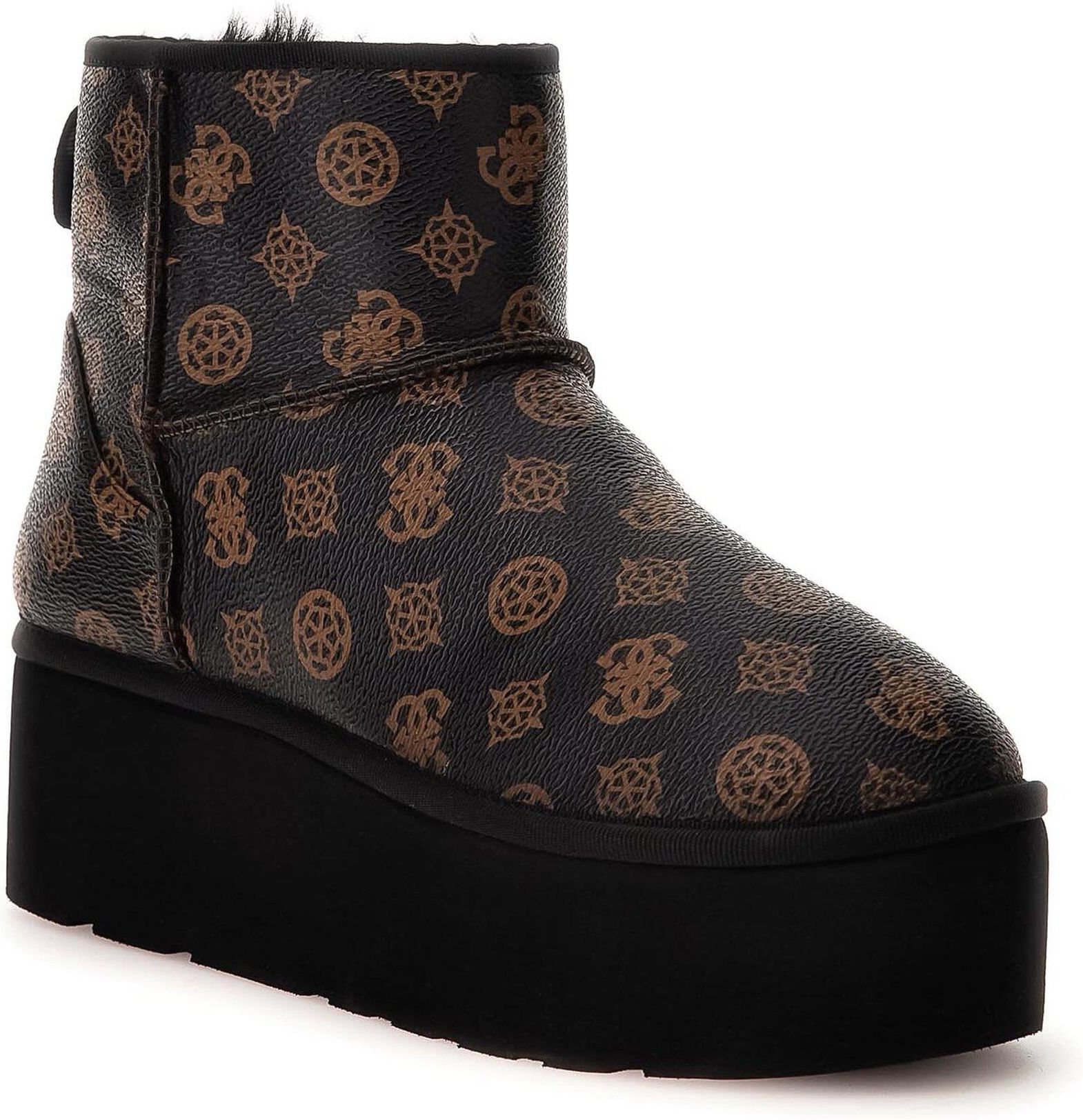 Oryginalne botki damskie typu śniegowce od renomowanej amerykańskiej marki Guess to absolutny must have tego sezonu! Skierowane do pewnych siebie kobiet, które lubią się wyróżniać i stawiają na odważne stylizacje. Najnowszy wzór śniegowców od Guess wykonany ze skóry ekologicznej w kolorze czarnym i brązowym "BROCR". Wnętrze jest ocieplone kożuszkiem syntetycznym, natomiast wkładka wykonana jest ze skóry naturalnej. Botki nie posiadają suwaka - są wsuwane. Model na solidnej i masywnej podeszwie typu platforma, o wysokości 5 cm z przodu i 6 cm w miejscu obcasa. Wejdź w nowy sezon ze stylowym i modnym obuwiem od marki Guess! Te buty bez wątpienia uzupełnią wiele stylizacji, czyniąc ją kompletną lub dodając jej pazura.