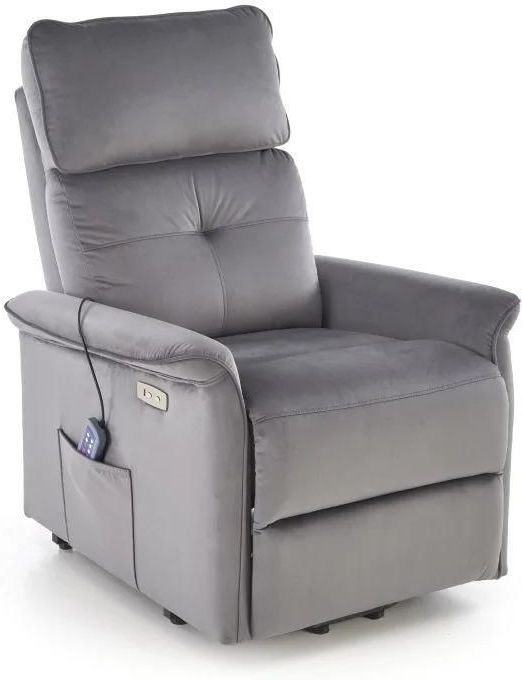 Fotel Masujący Wypoczynkowy Elektryczny do Masażu Szary Welurowy SEMIR 2 Fotel SEMIR 2 od Halmar Materiał: Tkanina velvet BLUVEL Kolorystyka: Popielaty (#14) Funkcje: Elektryczne rozkładanie, funkcja pionizacji, masaż, gniazdo USB Styl wykonania: Tradycyjny ZALETY Tkanina velvet BLUVEL - Delikatna, …