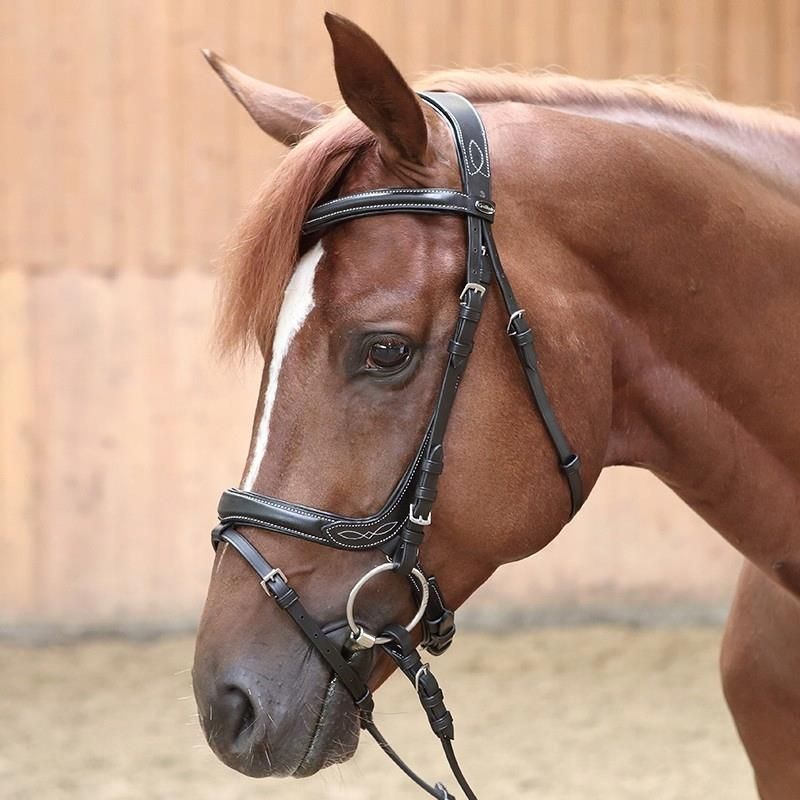 ogłowie skórzane marki Kavalkade z nachrapnikiem angielskim ze skośnikiem naczółek oraz paski nachrapnika z delikatnym ozdobnym haftem w kontrastowym kolorze pasek nachrapnika o anatomicznym kształcie doskonale dopasowuje się pozostawiając swobodę w pysku szeroki i odpowiednio wyprofilowany pasek potyliczny pozwala na swobodny ruch uszu konia delikatne paski będą wyglądały bardzo eleganckko na głowie konia doskonałe dla jeźdźców ceniąnych klasyczny i ponadczasowy wygląd ogłowia z delikatnym akcentem ozdobnym okucia w kolorze srebrnym w komplecie z gumowymi wodzami dostępny w dwóch kolorach: czarnym i brązowym
