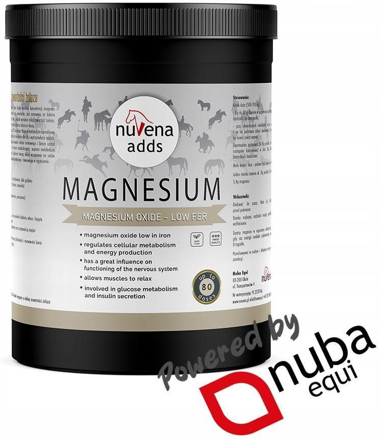 Tlenek magnezu to popularny wybór w suplementacji koni dzięki wysokiej koncentracji – nawet 57% magnezu, co czyni go jednym z najlepszych źródeł tego pierwiastka. Jest uznawany za dobrze przyswajalny i łagodny dla układu pokarmowego koni. Nasz produkt wyróżnia niska zawartość żelaza, co dodatkowo sprzyja zdrowiu koni, które często otrzymują nadmiar żelaza w diecie. Magnez nazywany jest pierwiastkiem życia. To zdecydowanie najważniejszy minerał w organiźmie regulujący ponad 300 enzymów. Ma wpływ na wydolność organizmu, siłę i wytrzymałość mięśni, metabolizm węglowodanów i aminokwasów, gdyż uczestniczy w syntezie białek. Jest niezbędny do prawidłowego funkcjonowania układu nerwowego i przewodnictwa nerwowego. Magnez jest istotny dla koni z insulinoopornością i zespołem metabolicznym, gdyż odgrywa ważną rolę w metaboliźmie glukozy i wydzielaniu insuliny. Kiedy stosować? w przypadku niskiego poziomu magnezu we krwi (niedobór występuje niezwykle rzadko, z uwagi na silną homeostazę tego pierwiastka) jako komponent do bilansowania pełnowartościowej dawki pokarmowej w przypadku niedoboru magnezu wykrytego w badaniu włosa lub kopyta u koni mających problemy z wydolnością treningową u koni mających problem z rozwinięciem masy mięśniowej oraz sztywnością mięśni u koni w ciężkim treningu w przypadku występowania nadreaktywności, nadmiernej płochliwości i nerwowości konia u koni z syndromem metabolicznym, insulinoopornością Rola magnezu w organiźmie bierze udział w metaboliźmie komórkowym oraz w produkcji energii reguluje wchłanianie wapnia i fosforu ma duży wpływ na funkcjonowanie układu nerwowego jako antagonista wapnia podwyższa próg pobudliwości nerwowo-mięśniowej, umożliwia rozluźnienie mięśni bierze udział w biosyntezie białka ma swój udział w metaboliźmie glukozy i wydzielaniu insuliny Objawy i skutki niedoboru napięcie nerwowe, poddenerwowanie skurcze mięśni, napięcie mięśni, problem z rozluźnieniem, bóle grzbietu brak energii i chęci do pracy, szybka męczliwość, osłabienie, osowiałość insulinooporność, otyłość, choroby metaboliczne narastanie napięcia i oporu z biegiem treningu, czasem objawiające się ponoszeniem, brykaniem, nerwowością bolesne ruje u klaczy Skład Tlenek magnezu o niskiej zawartości żelaza Zawartość magnezu [Mg] min. 54% Zawartość żelaza [Fe] max. 7g Sposób użycia dla dużych koni (500kg)* - 8 do 20 g dziennie w suplementacji profilaktycznej, wyższą dawkę należy rozdzielić na dwa posiłki - przy stwierdzonych niedoborach najlepiej przeanalizować dietę i na tej podstawie dobrać dawkowanie. Szczególnie ważne jest, by ocenić podaż wapnia. Ewentualnie zastosować 20-30 g produktu dziennie przez 30 dni, następnie kontynuować w ilości 20 g. Zaleca się wykonanie badań krwi. *Małe konie i kuce proporcjonalnie mniej. Jedna miarka zawiera ok 10g preparatu. Sposób przygotowania Dodawać do paszy. Może być zwilżona bezpośrednio przed podaniem. Dawkę najlepiej rozdzielać między posiłkami, aby zwiększyć wchłanianie. Zapasy magnezu w organiźmie odbudowują się opornie, więc gdy raz nastąpi niedobór suplementacja musi trwać minimum 8 tygodni. Przechowywać w suchym i chłodnym miejscu. Po użyciu szczelnie zamknąć. Opakowanie: 1200g (netto) O marce NuVena NuVena Adds to seria suplementów dla koni, głównie jednoskładnikowych. Przy zachowaniu najwyższych standardów produkcyjnych oraz wysokiej jakości surowców mamy przyjemność zaproponować Państwu produkty o bardzo atrakcyjnej cenie. Właścicielem marki NuVena jest firma Nuba Equi - w 100% Polski producent pasz i suplementów dla koni.