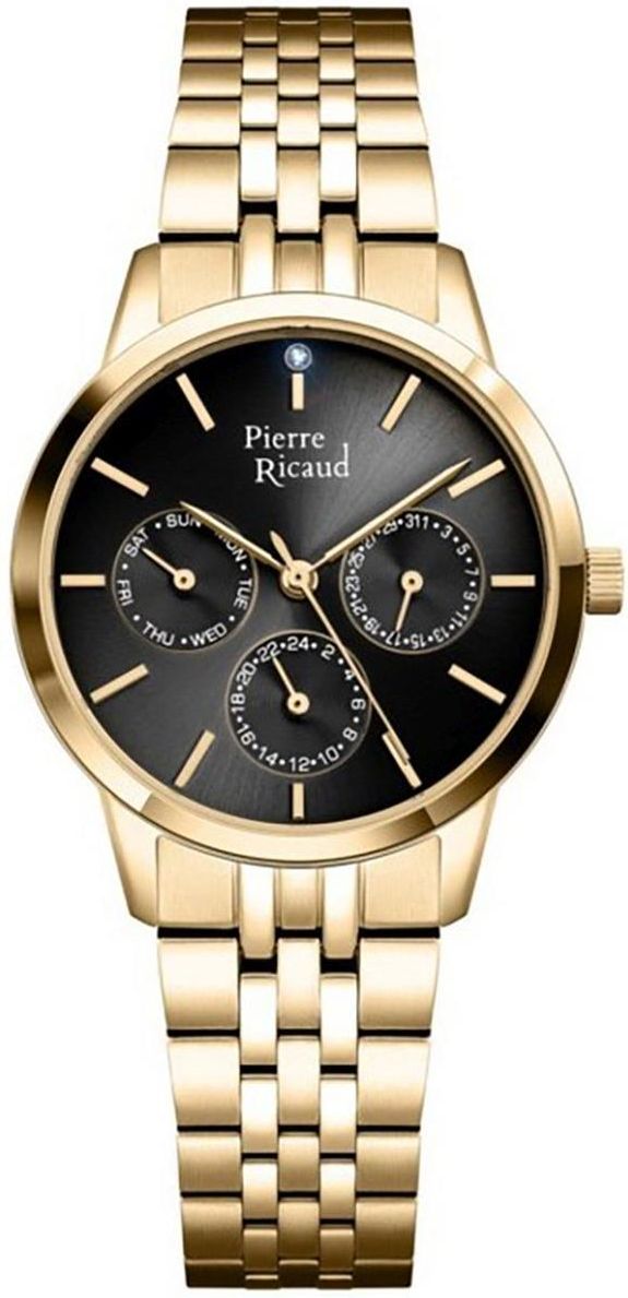 Mechanizm zegarka: Zegarek damski na złotej bransolecie Pierre Ricaud Classic P21056.1114QF wykonany ze stali szlachetnej z mechanizmem kwarcowym, zasilanym za pomocą baterii. Posiada bardzo wysoką dokładność mierzenia czasu +/- 10 sekund w przeciągu 30 dni. Mechanizm zegarka: Mechanizm japoński mieści się w stalowej, wytrzymałej, pozłacanej kopercie w kolorze złota w okrągłym kształcie . Wykorzystanie wysokiej jakości stali w bransolecie gwarantuje, że zegarek odporny jest na korozję i uszkodzenia oraz nie powoduje alergii. W zegarkach Pierre Ricaud wykorzystany jest jeden z najlepszych stopów stali 316 L pozłacany nowoczesną metodą pozłacania. Pierre Ricaud w produkcji zegarków wykorzystuje technologie powlekania powierzchni PVD (ang. Physical Vapour Deposition - fizyczne osadzanie z fazy gazowej): to bezpieczna dla środowiska i wyjątkowo trwała metoda powlekania. Powłoka PVD charakteryzuje się pięciokrotnie wyższa twardością (1150-1250 Vickersów) niż powłoki wykonywane techniką tradycyjna. Szkło zegarka: Zegarek wyposażony w szkło mineralne ( 5 stopień w skali Mohsa) - najczęściej spotykane, bardzo przejrzyste, czyste, cienkie, elastyczne i odporne na pęknięcia. Tarcza zegarka: Okrągła, klasyczna, czarna tarcza emanuje kobiecością. Subtelna elegancja pięknie uwidacznia się na klasycznych, szkieletowych wskazówkach w kolorze żółtego złota. Bransoleta zegarka: Bransoleta wykonana z wysokiej jakości stali w bransolecie gwarantuje, że zegarek odporny jest na korozję i uszkodzenia oraz nie powoduje alergii. Stop stali szlachetnej charakteryzuje się optymalna odpornością na korozje. W zegarkach Pierre Ricaud wykorzystany jest jeden z najlepszych stopów stali 316 L . Zapięcie bransolety: Dzięki standardowemu zapięciu wyposażonemu w klips z wyzwalaczem nie trzeba się obawiać że zegarek mógłby się zsunąć lub odpiąć. Zaś by go szybko odpiąć, wystarczy wcisnąć specjalny przycisk. Eleganckie zapięcie typu klips. Wodoszczelność: Zegarek z wodoszczelnością 30m (3 ATM), gwarantuje właścicielowi, że nie musi bać się zachlapań, czyli np. mycia rąk. Niemiecka marka Pierre Ricaud prezentuje w swojej czasomierze oraz biżuterie najwyższej jakości. Markę można określić jako połączenie wdzięku wprost z czerwonych dywanów z najwyższa, niemiecką jakością.Zegarki Pierre Ricaud w swojej stylistyce są eleganckie, sportowe i miejskie. Każdy znajdzie swój wymarzony model. Pierre Ricaud posiada w swojej ofercie zarówno zegarki dla kobiet jak i dla mężczyzn, dla młodszych i starszych. Tworzą zegarki idealne pod względem technicznym, cieszące oko. W Pierre Ricaud wykorzystywane są najwyższej jakości, japońskie mechanizmy Citizen. Wszystkie zegarki wykonane zostały z najlepszych surowców. Jeżeli kiedykolwiek zastanawiałeś się co zegarek mówi o człowieku, to zegarki Pierre Ricaud na pewno podkreślają osobowość każdego człowieka. Kobieta nosząca zegarek tej marki będzie osobą pewną siebie, dbającą o relacje i uwielbiająca klasykę, przełamaną nowoczesnością. Zegarki damskie marki Pierre Ricaud to styl i elegancja. Pełna gama różnorodności sprawia że każda kobieta znajdzie czasomierz dla Siebie. Użycie szlachetnych materiałów takich jak np. masa perłowa, która dodaje całości niezwykłego wyrazu, ponieważ niczym pawie piórko mieni się tysiącem barw. Dodając tej element, zegarek nabiera dużej wielowymiarowości. Jeżeli nie wiesz jaką bryłę koperty wybrać, to zegarki Pierre Ricaud mają całą paletę brył. Charakteryzują się one dosyć dużą kopertą, która w ciekawy sposób kontrastuje z bardzo wąskimi paskami. Tarcze tych zegarków, są zazwyczaj minimalistyczne, choć zdarzają się zegarki z kryształami Swarovskiego. Również w ofercie znajdziemy damskie chronografy, które przypadną do gustu kobietom lubiącym wyraziste i duże określenie swojego designu. Zegarki męskie firmy Pierre Ricaud to połączenie prostych tarcz, o mocnych kolorach i czytelnych cyfrach rzymskich bądź arabskich lub stylu typowo modnego, nowoczesnego z małymi sub tarczami i elementem stopera wpisanego w oryginalny zegarek. Jeżeli zastanawiałeś się jaki zegarek wybrać na prezent to marka Pierre Ricaud sprosta nawet najbardziej wybrednym gustom. Szerokie bransolety, najwyższej jakości skórzane paski z trwałymi zapięciami będą długo służyły na męskich nadgarstkach. Bez problemu można skomponować je z codziennymi stylizacjami, a umiejętnie dobrane będą podkreślały również te bardziej wymagające i eleganckie. Jednak każdy model jest tego w 100% warty, po długich namysłach można wejść w posiadanie naprawdę nietuzinkowego czasomierza, który będzie świetnym kompanem życia oraz podczas wyjątkowych okazji. Bransoletki damskie oraz męska biżuteria Pierre Ricaud to wzory które przypadną do gustu każdemu. Bransoletki od wieków zdobią kobiece nadgarstki, a ostatnio stały się wręcz niezbędnym elementem ubioru, zarówno tego codziennego, jak i wieczorowego. U nas idealną bransoletkę, znajdą zarówno panie ceniące sobie minimalistyczne, delikatne ozdoby, jak i klientki stawiające na rozmach i szykowność każdej stylizacji. Oferowane produkty łatwo dopasujesz do typu swojej urody. Wiadomo przecież, że co innego pasuje blondynkom czy szatynkom, a co innego rudym czy brunetkom. Także karnacja i kolor oczu ma niebagatelne znaczenie w doborze biżuterii. Autoryzowany sklep z zegarkami oraz biżuteria Pierre Ricaud - Zegarki-Diament.pl to sklep internetowy o sprawdzonych opiniach. Kupując zegarek od zegarmistrza otrzymujesz najwyższą jakość. Wszystkie zegarki męskie , damskie oraz biżuteria marki Pierre Ricaud zakupione w naszym sklepie posiadają 2 letnią gwarancję i zapakowane są w oryginalne opakowania.