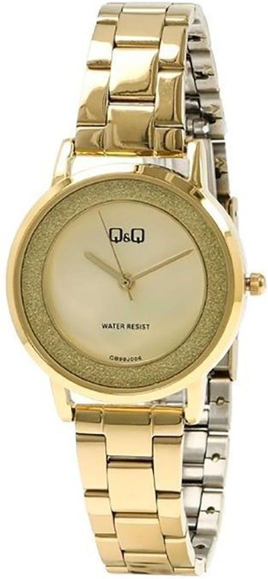 MECHANIZM: Zegarek damski QQ na bransolecie QB99-006 wyposażony jest w kwarcowy mechanizm, zasilany za pomocą baterii. Posiada bardzo wysoką dokładność mierzenia czasu +/- 10 sekund w przeciągu 30 dni. KOPERTA: Mechanizm japoński mieści się w metalowej, wytrzymałej kopercie. Koperta wykonana z ALLOY’u, czyli bardzo popularnego stopu metali na bazie mosiądzu. Charakteryzuje się stosunkowo niewielka wagą, a jednocześnie dużą wytrzymałością. Koperta nie zawiera niklu i innych pierwiastków szkodliwych dla zdrowia. Wykorzystanie wysokiej jakości stali w deklu (dolna część zegarka) gwarantuje, że czasomierz odporny jest na korozję i uszkodzenia oraz nie powoduje alergii. Stop stali szlachetnej charakteryzuje się optymalna odpornością na korozje. W zegarkach Q&Q wykorzystany jest jeden z najlepszych stopów stali 316 L. SZKŁO: Zegarek wyposażony w szkło mineralne ( 5 stopień w skali Mohsa) - najczęściej spotykane, bardzo przejrzyste, czyste, cienkie, elastyczne i odporne na pęknięcia. TARCZA: Tarcza zegarka minimalistyczna okrągła w kolorze złotym. BRANSOLETA: Wykorzystanie wysokiej jakości stali w bransolecie gwarantuje, że zegarek odporny jest na korozję i uszkodzenia oraz nie powoduje alergii. ZAPIĘCIE: Standardowe zamknięcie na podwójny zatrzask gwarantuje posiadaczowi tego zegarka, że nie zsunie mu się z ręki nawet w momencie niechcącego otwarcia. Natomiast zamknięcie bransolety odbywa się przez zatrzaśnięcie. WODOSZCZELNOŚĆ: Zegarek z wodoszczelnością 30m (3 ATM), gwarantuje właścicielowi, że nie musi bać się zachlapań, czyli np. mycia rąk. Zapoznaj się z pozostałą ofertą ofertą damskich zegarków . Zegarki damskie są dla kobiet biżuterią ale również praktycznym dodatkiem. Oprócz sprawdzenia czasu kobiety uwielbiają za pomocą zegarka sprawdzać swoją aktywność fizyczną. Aktualnie zegarki potrafią zachęcić do wzmożonej aktywności fizycznej poprzez posiadanie funkcji takich jak: zliczanie wyników, dopingowanie do osiągania wyznaczonego celu, wyniku aktywności w ciągu dnia. Swój wymarzony model znajdą u Nas kobiety, które uwielbiają domowe zacisze ale również te o rozrywkowym podejściu do życia. Do wyboru mamy zatem typowo klasyczne modele o stonowanych kolorach, ekskluzywne zegarki złote damskie, czy modowe egzemplarze zachwycające swoim niebanalnym widokiem. Zegarek damski japońskiej marki Q&Q na rękę może przyjąć różny wygląd i styl. Niezwykle dużą popularnością cieszą się egzemplarze od tej wieloletniej firmy z tradycją. Marka ta zyskał uznanie na polskim rynku dzięki oryginalnym i ponadczasowym wzorom stosowanym w swoich produktach. Uniwersalne zegarki damskie czarne i białe o doskonałym wykonaniu skradają serca wielu Pań w różnym wieku. Niektóre to całkowicie klasyczne modele, inne bardziej szałowe zyskały intensywny złoty kolor oraz różnego rodzaju zdobienia w postaci szlifu słonecznego lub nałożonych na tarczę połyskujących kamyków. Bez najmniejszego problemu znajdziemy tutaj modowe zegarki na bransolecie damskie, czy proste na tradycyjnym skórzanym pasku. Marka japońskich zegarków Q&Qpojawiła się na rynku po raz pierwszy w roku 1976. Od pewnego czasu, marka Q&Q rozwija się prężnie w dziedzinie zegarków elektronicznych, i analogowych zegarków kwarcowych. Sama nazwa – Q&Q – pochodzi od angielskiego Quality & Quantity (Jakość i Ilość), co oznacza produkcję z zachowaniem wysokich standardów jakości. Każdy znajdzie dla siebie odpowiedni zegarek ,szeroki asortyment marki, bogate wzornictwo i nowoczesne technologie zadowolą każdego użytkownika. Nasz sklep internetowy z zegarkami Q&Q jest autoryzowanym dystrybutorem marki. Wszystkie damskie i męskie zegarki Q&Q zakupione w naszym sklepie posiadają 2 letnią gwarancję (z możliwością przedłużenia gwarancji do 3 lat) i zapakowane są w oryginalne opakowanie producenta. Jest to eleganckie pudełko do zegarka z logiem japońskiej marki Q&Q.