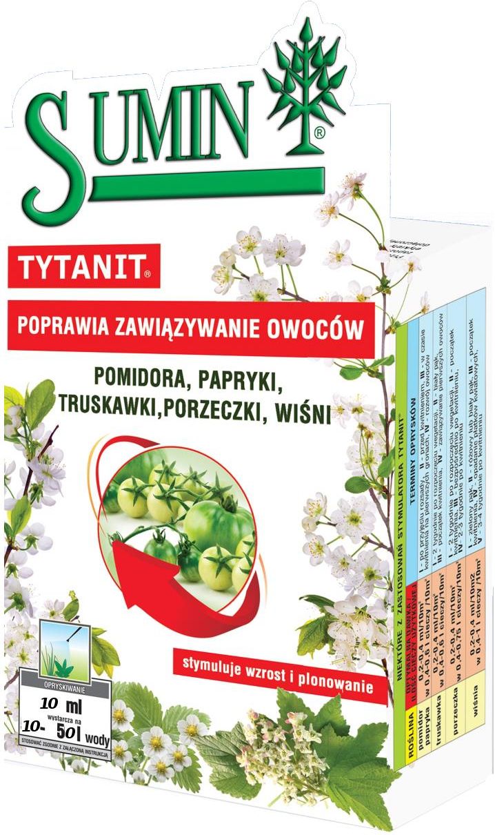 TYTANIT SUMIN 10ML STYMULATOR WZROSTU POPRAWIAJĄCY ZAWIĄZYWANIE OWOCÓW POMIDORA, PAPRYKI, WIŚNI, PORZECZKI I TRUSKAWKI Stymulator wzrostu wpływający na poprawę zawiązywania owoców pomidora, papryki, wiśni, porzeczki i truskawki. Poprawia jakość pyłku kwiatowego, stymuluje procesy zapylenia i zapłodnienia, a także sprzyja prawidłowemu rozwojowi zawiązków, dzięki czemu podnosi plonowanie roślin i przyspiesza zbiory. Wpływa też jakość plonów. Tytanit wzmacnia system odpornościowy roślin na choroby i szkodniki oraz stymuluje wszystkie procesy biochemiczne, w tym fotosyntezę, oddychanie czy transpirację. Dodatkowo zwiększa odporność roślin na niekorzystne warunki atmosferyczne takie jak susza, nadmierna wilgoć i niskie lub zbyt wysokie temperatury. Powoduje szybszy rozwój części nadziemnych i podziemnych roślin. Skład: tytan (Ti) - 0,8% (8,5 g Ti w 1 litrze stymulatora) Dawkowanie - jak stosować stymulator wzrostu Tytanit Sumin? pomidor, papryka - 2,5 - 5 ml w 5 - 7,5 l cieczy / 125 m2 truskawka - 2,5 - 5 ml w 5 - 7,5 l cieczy / 125 m2 porzeczka - 2,5 - 5 ml w 5 - 9,4 l cieczy / 125 m2 wiśnia - 2,5 - 5 ml w 5 - 12,5 l cieczy / 125 m2 Jak działa stymulator wzrostu Tytanit? Zalety: większa ilość i jakość plonów, poprawa jakości pyłku kwiatowego, stymulacja procesów zapylenia i zapłodnienia, szybsze pobieranie składników pokarmowych i wody przez rośliny, lepsza odporność roślin na choroby, szkodniki i negatywne czynniki atmosferyczne, wspomaganie regeneracji roślin, które zostały osłabione przez czynniki stresowe (np. suszę), dłuższa żywotność pyłku kwiatowego, dzięki czemu zwiększa się ilość zawiązywanych owoców, produkt wysokowydajny. Zalecenia stosowania stymulatora wzrostu Tytanit Nawóz do stosowania dolistnego i fertygacji. Należy dokładnie pokryć roztworem całą powierzchnię liści. Zalecane jest wykonanie od 2 do 5 zabiegów w sezonie wegetacyjnym. ​Tytanit można stosować z nawozami dolistnymi i środkami ochrony roślin po przeprowadzeniu testu sprawdzającego możliwość wykonania i zastosowania roztworu wieloskładnikowego.