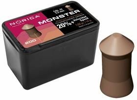 Śrut Norica Monster 5,5mm (198.00.006) to wysokiej klasy miedziane śruciny do pistoletów i karabinków wiatrówkowych. Doskonałe połączenie precyzji i siły uderzenia - nawet z dużej odległości. Proces produkcji zapewnia wszystkie normy dotyczące jakości i precyzji ich wykonania co potem przekłada się na doskonałą celność przy strzelaniu do celu. Jego szpiczasty kształt zmniejsza opór powietrza, jednak kształt przestrzeliny w tarczy jest mniej równy. Miedziane śruciny mają 20% większą prędkość niż ołowiane w podobnej wadze. Jest to bardzo precyzyjny śrut, który nadaje się do strzelectwa dynamicznego. Jest to śrut wykonany tak precyzyjnie, że poprawia celność nawet tych słabszych wiatrówek, nawet na dużych odległościach. Zdecydowanie najlepiej sprawdza się w wiatrówkach Norica, jednak nie ma przeciwwskazań, aby strzelać nim z karabinków innych marek. Polecany do wiatrówek ze sprężyną gazową GRS lub PCP. Plastikowe pudełko zawiera 150 szt. śrutu.