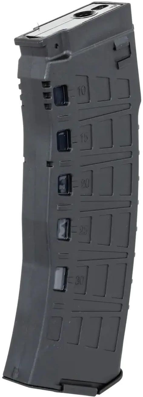 Magazynek typu Mid-Cap o zmiennej pojemności 130 lub 30 kulek i konstrukcji EMM (Enhanced Modular Magazine), przeznaczony do replik AK. Obudowa została wykonana ze wzmocnionego polimeru, stopka magazynka z czernionej stali.