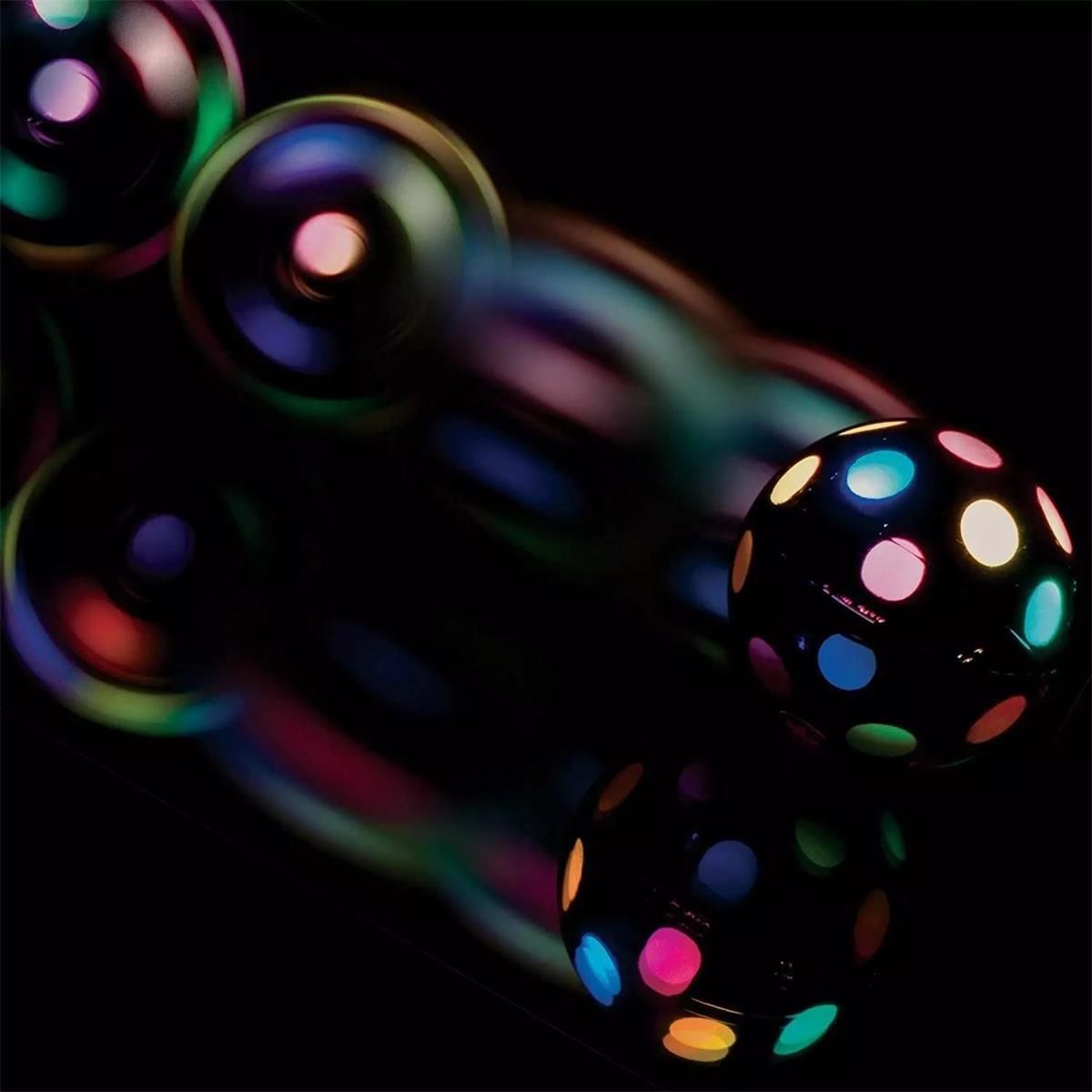 Świecąca kula dyskotekowa Zabawka imitująca czarną kulę dyskotekową z kolorowymi punktami o średnicy około 4.5cm. Kula ma gładką powierzchnię przez co doskonale turla się po płaskich powierzchniach. Kula może błyskać bardzo intensywnym, kolorowym światłem. Aby ją uruchomić należy mocniej uderzyć o twardą powierzchnię. Świecąca kula podczas turlania się generuje interesujące efekty świetlne.
