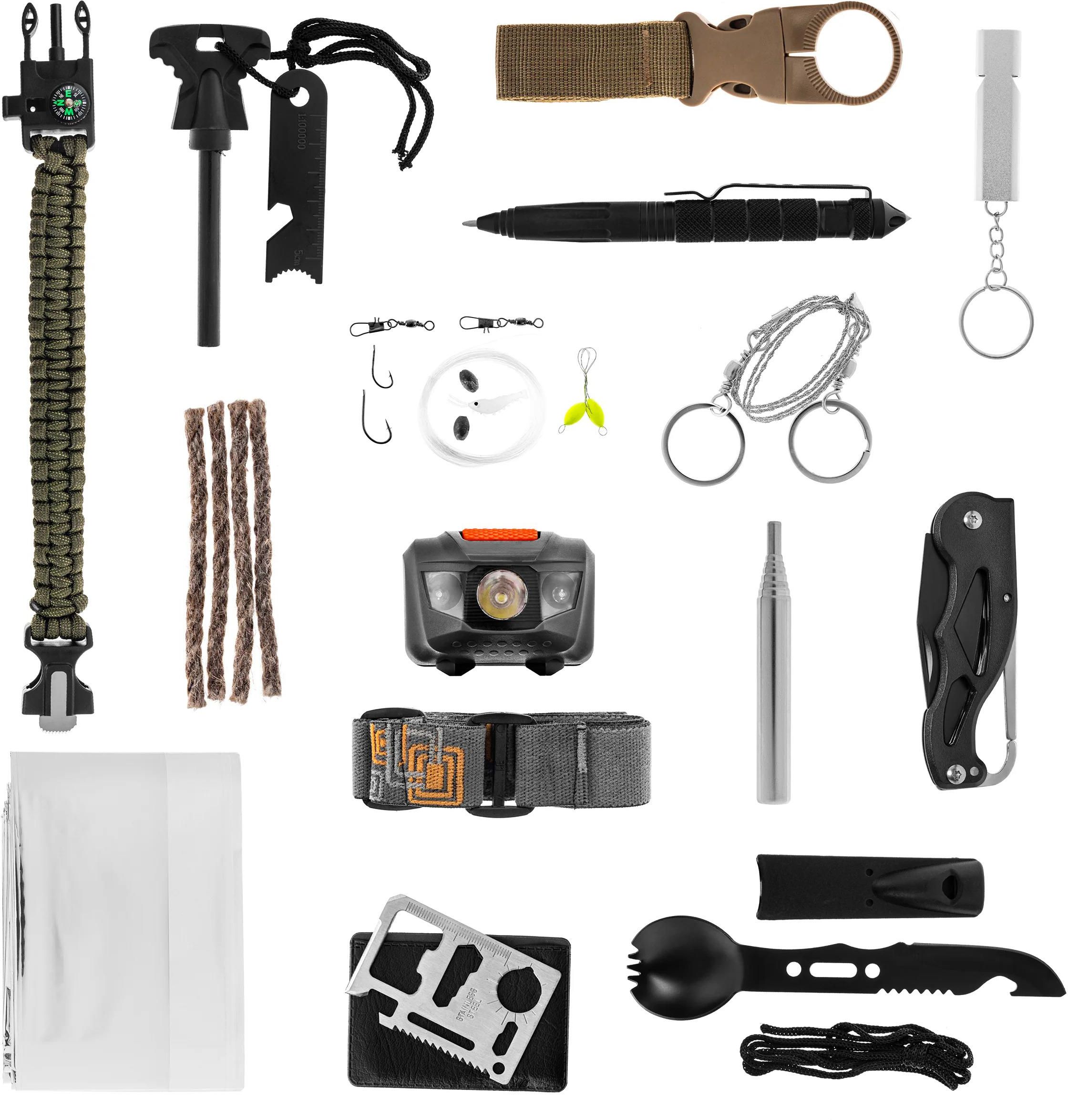 Duży zestaw survivalowy ze starannie dobranymi elementami, które znajdą zastosowanie zarówno podczas biwakowania, kempingu, w sytuacjach awaryjnych takich jak nagła ewakuacja, blackoutu oraz podczas codziennych prac i aktywności. W zestawie znajdują się m.in. narzędzia i akcesoria umożliwiające rozpalanie ognia, przygotowanie posiłku czy udzielanie pierwszej pomocy. Cała zawartość zamknięta jest w praktycznym, wytrzymałym pudełku transportowym wykonanym z tworzywa.