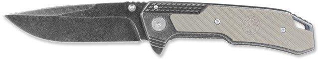 Stal: 8Cr13MoV High Carbon Stainless Steel Długość całkowita: 210 mm Długość po złożeniu: 120 mm Długość ostrza: 91 mm Grubość ostrza: 2,85 mm Typ ostrza: Drop Point Blokada: Liner Lock Okładziny: stal nierdzewna + G10 Waga: 166 g Nóż składany Smith & Wesson SW609. Cechy: - ostrze z wysokowęglowej stali nierdzewnej 8Cr13MoV - otwierane za pomocą obustronnego kołka lub poprzez wypchnięcie jelcowatego kształtu - wykończenie Stone Wash - stalowa blokada Frame Lock - rękojeść ze stali nierdzewnej - z jednej strony wstawka z materiału G10 - klips typu "tip-down, deep-carry" - otwór na smycz
