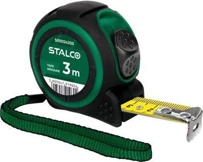 Miara zwijana 3 m x 16 mm marki STALCO z antypoślizgową obudową ABS z gumą TPS absorbuje uderzenia podczas upadku. Posiada dwa przyciski blokady taśmy mierniczej, które dają możliwość chwilowego lub stałego zatrzymania taśmy mierniczej. Trzy nity mocujące zaczep z taśmą mierniczą zwiększają odporność na uszkodzenia mechaniczne. II klasa dokładności taśmy. Wytrzymały pasek na nadgarstek odporny na działanie promieni UV oraz wysokich i niskich temperatur. Taśma z wysokiej jakości stali węglowej o grubości (stal+lakier) od 0,135-0,145 mm i zwiększonej odporności na uszkodzenia mechaniczne. Posiada stabilniejszy proces zwijania taśmy. Sprężyna ze stali manganowej 65G, dodatek manganu przekłada się na wydłużoną żywotność i sprawność sprężyny-pozwala skutecznie zwijać delikatnie odkształcone i zanieczyszczone pyłem budowlanym taśmy.