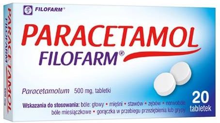 Paracetamol Filofarm to wszechstronny lek, który pomaga w różnych rodzajach bólu i obniża gorączkę. Dla pacjentów powyżej 12. roku życia. Lek Paracetamol Filofarm zawiera jako substancję czynną paracetamol, wykazujący działanie przeciwbólowe i przeciwgorączkowe. W wyniku hamowania cyklooksygenazy kwasu arachidonowego, zapobiega tworzeniu się prostaglandyn w ośrodkowym układzie nerwowym. Zmniejszenie stężenia prostaglandyn w podwzgórzu wywołuje działanie przeciwgorączkowe. Działanie przeciwbólowe zbliżone jest do działania niesteroidowych leków przeciwzapalnych (NLPZ), jednak paracetamol w odróżnieniu od leków tej grupy nie hamuje obwodowej syntezy prostaglandyn. Dlatego nie działa przeciwzapalnie i nie wywołuje typowych dla NLPZ działań niepożądanych. Paracetamol nie wpływa na agregację płytek krwi. Jest lekiem z wyboru w leczeniu bólu i gorączki. Paracetamol Filofarm stosuje się: w bólach o różnej etiologii: bóle głowy, mięśni, zębów, stawów, nerwobóle, bóle miesiączkowe; w gorączce, np. w przebiegu przeziębienia lub grypy. Lek ten jest przeznaczony dla pacjentów w wieku powyżej 12 lat. Przeciwwskazania Kiedy nie stosować leku Paracetamol Filofarm jeśli pacjent ma uczulenie (nadwrażliwość) na paracetamol lub którykolwiek z pozostałych składników tego leku (wymienionych w punkcie 6). Ze względu na ryzyko przedawkowania należy sprawdzić, czy inne przyjmowane leki nie zawierają paracetamolu; jeśli u pacjenta stwierdzono ciężką niewydolność wątroby lub nerek; jeśli u pacjenta stwierdzono wrodzony niedobór dehydrogenazy glukozo-6-fosforanowej lub niedokrwistość hemolityczną; jeśli u pacjenta stwierdzono wrodzony niedobór reduktazy methemoglobinowej; jeśli pacjent stosuje inhibitory monoaminooksydazy (MAO) (np. selegilina – lek stosowany w leczeniu depresji i niedociśnienia tętniczego), oraz przez okres do 2 tygodni po ich odstawieniu. Ostrzeżenia Przed rozpoczęciem stosowania tego leku należy omówić to z lekarzem lub farmaceutą: jeśli u pacjenta występuje: łagodna do umiarkowanej niewydolność wątroby (w tym zespół Gilberta), ostre zapalenie wątroby, pacjent jednocześnie leczy się innymi lekami, które mają wpływ na czynność wątroby, jeśli pacjent nadużywa alkoholu lub jeśli pacjent niedostatecznie się odżywia, gdyż istnieje ryzyko uszkodzenia wątroby; jeśli u pacjenta występuje niewydolność nerek; jeśli u pacjenta występuje astma oskrzelowa; Należy zwrócić się do lekarza, nawet jeśli powyższe ostrzeżenia dotyczą sytuacji występujących w przeszłości. Lek zawiera paracetamol. Ze względu na ryzyko przedawkowania nie należy stosować z innymi lekami zawierającymi paracetamol i dlatego należy sprawdzić, czy inne przyjmowane leki nie zawierają paracetamolu. Dzieci i młodzież Lek nie jest przeznaczony do stosowania u dzieci w wieku poniżej 12 lat i dlatego nie należy go stosować w tej grupie wiekowej. Paracetamol Filofarm a inne leki Należy powiedzieć lekarzowi o wszystkich lekach przyjmowanych obecnie lub ostatnio a także o lekach, które pacjent planuje stosować. Leku nie należy stosować równocześnie z innymi lekami zawierającymi paracetamol. Paracetamol może nasilać działanie leków przeciwzakrzepowych (warfaryny, kumaryny). Jednoczesne podawanie z ryfampicyną (antybiotyk), izoniazydem (lek przeciwgruźliczy), barbituranami (lek nasenny), lekami przeciwpadaczkowymi, diflunizalem (niesteroidowy lek przeciwzapalny), sulfinpirazonem (lek stosowany w leczeniu dny moczanowej) lub innymi lekami o podobnym wpływie na wątrobę (indukującymi enzymy mikrosomowe), zwiększa ryzyko uszkodzenia wątroby. Paracetamol podawany łącznie z inhibitorami monoaminooksydazy (np. selegilina – lek stosowany w leczeniu depresji i niedociśnienia tętniczego) może wywołać stan pobudzenia i wysoką gorączkę. Stosowanie paracetamolu łącznie z zydowudyną (lek przeciwwirusowy) może powodować neutropenię (zagrażający życiu niedobór neutrofilów - pewnego typu białych krwinek) oraz zwiększać ryzyko uszkodzenia wątroby. Kofeina nasila przeciwbólowe działanie paracetamolu. Paracetamol Filofarm z jedzeniem, piciem i alkoholem W okresie przyjmowania produktu nie wolno pić alkoholu. Nie należy pić alkoholu podczas stosowania leku Paracetamol Filofarm. Ciąża, karmienie piersią i wpływ na płodność Jeśli pacjentka jest w ciąży lub karmi piersią, przypuszcza, że może być w ciąży lub gdy planuje mieć dziecko, powinna poradzić się lekarza lub farmaceuty przed zastosowaniem tego leku. Badania na zwierzętach nie wykazały ryzyka dla płodu, jednak nie przeprowadzono kontrolowanych badań u kobiet w ciąży. Paracetamol Filofarm można stosować w czasie ciąży. Należy przyjmować możliwie najmniejszą dawkę zmniejszającą ból i (lub) gorączkę, przez jak najkrótszy czas i jak najrzadziej. Należy skonsultować się z lekarzem, jeżeli ból i (lub) gorączka nie zmniejszają się lub gdy pacjentka potrzebuje częściej przyjmować lek. Tak jak inne leki, paracetamol może być stosowany w okresie ciąży tylko na polecenie lekarza, w razie zdecydowanej konieczności. Paracetamol przenika do mleka w ilości 0,1% do 1,85% dawki przyjętej przez matkę. Tak jak inne leki paracetamol może być stosowany w okresie karmienia piersią tylko w razie zdecydowanej konieczności. Prowadzenie pojazdów i obsługiwanie maszyn Paracetamol Filofarm stosowany zgodnie z zaleceniami nie wpływa na zdolność kierowania pojazdami mechanicznymi, obsługę maszyn i sprawność psychofizyczną. Sposób użycia Ten lek należy zawsze stosować dokładnie tak, jak opisano to w ulotce dla pacjenta lub według zaleceń lekarza czy farmaceuty. W razie wątpliwości należy zwrócić się do lekarza lub farmaceuty. Dorośli: Zwykle stosuje się doustnie 1 lub 2 tabletki (co dopowiada 500 mg do 1000 mg paracetamolu), w razie konieczności do 3 lub 