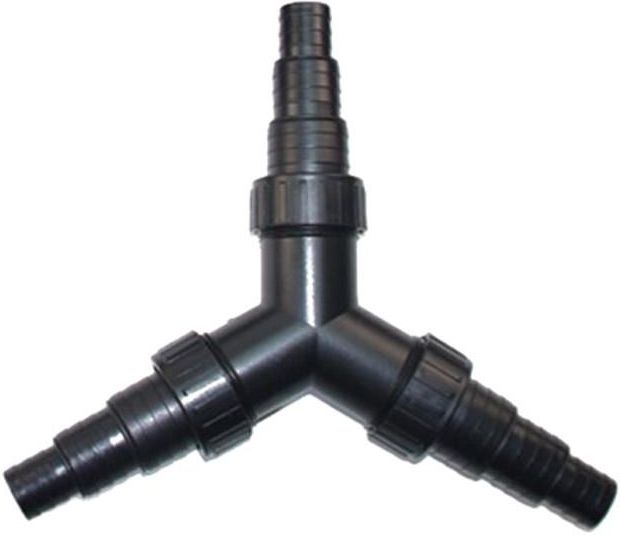 Uniwersalny trójnik / rozdzielacz do węży ogrodowych oraz akwarystycznych. Trójnik posiada króćce przyłączeniowe umożliwiające zaadoptowanie przewodów o średnicy 25mm, 32, oraz 40mm. Trójnik wykonany jest z tworzywa całkowicie odpornego na działanie wody i promieni słonecznych. Umożliwia podłączenie filtra i np. fontanny lub kaskady wodnej jednocześnie na jednej pompie. Posiada króćce przyłączeniowe umożliwiające podłączenie węzy 25/32/40mm. Dane techniczne: - wymiary: 275 x 240mm - średnica węży 25/32/40mm