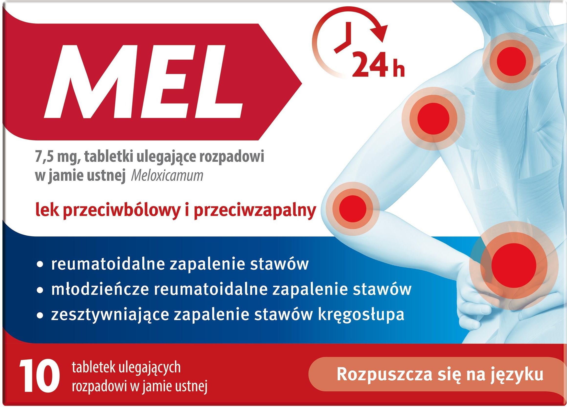 Mel to lek w postaci tabletek ulegających rozpadowi w jamie ustnej. Substancją czynną preparatu jest meloksykam zaliczany do grupy niesteroidowych leków przeciwzapalnych (NLPZ) o działaniu przeciwzapalnym, przeciwbólowym i przeciwgorączkowym. Mechanizm działania przeciwzapalnego meloksykamu polega na preferencyjnym hamowaniu cyklooksygenazy COX-2 w stosunku do COX-1. Wskazaniem do stosowania leku Mel są bóle kostno-stawowe i mięśniowe w przebiegu chorób reumatoidalnych i zwyrodnieniowych stawów. Preparat może być także stosowany w krótkotrwałym leczeniu zaostrzeń objawów chorób reumatoidalnych, takich jak reumatoidalne zapalenie stawów, młodzieńcze reumatoidalne zapalenie stawów oraz zesztywniające zapalenie stawów kręgosłupa u dorosłych oraz młodzieży powyżej 15 roku życia. Wskazania Bóle kostno-stawowe i mięśniowe w przebiegu chorób reumatoidalnych i zwyrodnieniowych stawów. Krótkotrwałe leczenie zaostrzeń objawów chorób reumatoidalnych, w tym reumatoidalnego zapalenia stawów, młodzieńczego reumatoidalnego zapalenia stawów oraz zesztywniającego zapalenia stawów kręgosłupa. Skład 1 tabletka zawiera: substancję czynną: meloksykam 7,5 mg, substancje pomocnicze: betadeks, aromat malinowy SD0621M, aromat truskawkowy SD1634, aromat waniliowy SD1333, sodu cytrynian bezwodny, aspartam (E 951), Pearlitol Flash (d-mannitol, skrobia kukurydziana, woda oczyszczona), Ludiflash (octan poliwinylu, powidon K30, krospowidon (typ B), d-mannitol, woda oczyszczona), krospowidon (typ B), sodu stearylofumaran, acesulfam potasowy (E 950). Działanie Przeciwzapalne, przeciwbólowe, przeciwgorączkowe. Dawkowanie Dorośli i młodzież powyżej 15 roku życia: 1 tabletka na dobę. Tabletkę należy umieścić na języku i pozwolić by uległa rozpuszczeniu, a następnie połknąć. W razie potrzeby rozpuszczoną tabletkę można popić wodą. Lek Mel może być stosowany, jako kontynuacja terapii po uprzedniej wizycie u lekarza. Bez konsultacji z lekarzem nie stosować dłużej niż 7 dni. Jeśli po upływie 7 dni nie nastąpiła poprawa lub pacjent czuje się gorzej, należy zwrócić się do lekarza. Przeciwwskazania Uczulenie na meloksykam lub którykolwiek z pozostałych składników leku. Uczulenie na aspirynę lub inne niesteroidowe leki przeciwzapalne (NLPZ). Pojawienie się w przeszłości jakiekolwiek z poniższych objawów po zastosowaniu aspiryny lub innych niesteroidowych leków przeciwzapalnych (NLPZ): świszczący oddech, uczucie ucisku w klatce piersiowej, duszność (astma), niedrożność nosa z powodu obrzęku błony śluzowej nosa (polipy nosa), wysypka skórna (pokrzywka), nagły obrzęk skóry lub błon śluzowych, na przykład obrzęk wokół oczu, twarzy, warg, jamy ustnej lub gardła, mogący ewentualnie utrudniać oddychanie (obrzęk naczynioruchowy). Wystąpienie u pacjenta po wcześniejszym leczeniu NLPZ: krwawienia z żołądka lub jelit, perforacji żołądka lub jelit. Stwierdzona choroba wrzodowa lub krwawienie z żołądka i/lub dwunastnicy. Przebyta choroba wrzodowa żołądka i/lub dwunastnicy lub wystąpiło krwawienie z przewodu pokarmowego (choroba wrzodowa lub krwawienia występujące co najmniej dwa razy). Ciężkie zaburzenia czynności wątroby. Wystąpienie ostatnio krwawienia w obrębie mózgu (krwawienie z naczyń mózgowych) oraz w przypadku wystąpienia w przeszłości jakichkolwiek innych krwawień. Ciężka niewydolność serca. Nie stosować: u pacjentów niedializowanych z ciężką niewydolnością nerek, w trzech ostatnich miesiącach ciąży i w okresie karmienia piersią, u dzieci i młodzieży w wieku poniżej 15 lat. Przechowywanie Przechowywać: w temperaturze poniżej 25°C, w oryginalnym opakowaniu w celu ochrony przed wilgocią, w miejscu niewidocznym i niedostępnym dla dzieci. Działania niepożądane Mel jak każdy inny lek może powodować działania niepożądane, chociaż nie u każdego one wystąpią. Jeśli wystąpi którakolwiek z niżej opisanych reakcji, należy przerwać stosowanie leku i skonsultować się z lekarzem lub najbliższym szpitalnym oddziałem ratunkowym: jakiekolwiek reakcje alergiczne (nadwrażliwość), które mogą objawiać się w następujący sposób: reakcje skórne, takie jak swędzenie (świąd), powstawanie pęcherzy i łuszczenie się skóry, mogące mieć ciężki przebieg (zespół Stevensa-Johnsona i toksyczne martwicze oddzielanie się naskórka), uszkodzenia tkanek miękkich (zmiany na błonach śluzowych) lub rumień wielopostaciowy, obrzęk skóry lub błon śluzowych, na przykład obrzęk w okolicy oczu, twarzy i warg, jamy ustnej lub gardła, mogący utrudniać oddychanie, obrzęk kostek i nóg (obrzęki kończyn dolnych), duszność lub napad astmy, zapalenie wątroby, które może spowodować takie objawy, jak: zażółcenie skóry i gałek ocznych (żółtaczka), ból brzucha, utrata apetytu, jakiekolwiek objawy niepożądane ze strony przewodu pokarmowego, a w szczególności: krwawienia (powodujące smoliste stolce), owrzodzenia przewodu pokarmowego (powodujące ból brzucha). Jeśli u pacjenta wcześniej występowały jakiekolwiek zaburzenia ze strony układu pokarmowego, z powodu długotrwałego stosowania NLPZ, pacjent powinien niezwłocznie zasięgnąć porady lekarza, zwłaszcza jeśli jest w podeszłym wieku. Lekarz może monitorować jednocześnie postępy w leczeniu. Jeśli stosowanie leku wywołuje zaburzenia widzenia, nie należy prowadzić pojazdów ani obsługiwać maszyn. Ogólne działania niepożądane wynikające ze stosowania niesteroidowych leków przeciwzapalnych (NLPZ) Stosowanie niektórych niesteroidowych leków przeciwzapalnych (NLPZ) może być związane z niewielkim wzrostem ryzyka niedrożności tętnic (zakrzepica tętnic), np. zawał serca lub udar mózgu, szczególnie po zastosowaniu leku w dużych dawkach i leczenia długotrwałego. W związku z leczeniem NLPZ zgłaszano występowanie obrzęków, nadciśnienia tętnic