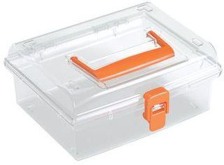 Zamykany, przezroczysty organizer, skrzynka z rączką o wymiarach 195 x 174 x 85. Służy do przechowywania drobnych elementów elektronicznych. Organizer posiada uchwyt w kolorze czarnym oraz pomarańczowym, wysyłany losowo.