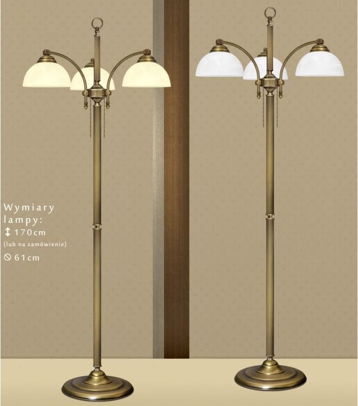 Mosiężna lampa podłogowa z trzema kloszami. - Wykonana w całości z elementów z pełnego mosiądzu. - Wykończenie: złota patyna. - Klosze szklane do wyboru: biały ‘alabaster’ lub ecru ‘alabaster’ (albo na zamówienie ecru gładki w zależności od dostępności). - Wymiary całkowite: wysokość 170cm (lub inna na zamówienie), średnica 61cm, średnica kloszy 19cm. - Niezależne włączanie 1/2/3 źródeł światła (włącznikami łańcuszkowymi umieszczonymi na puszce mosiężnej na wysokości kloszy). Na zamówienie (bez dopłaty) możliwość instalacji włącznika podłogowego na kablu zasilającym. - Możliwość wykonania lampy o mniejszej/większej ilości ramion.- W podstawie lampy umieszczony jest odważnik zapewniający jej stabilność.- Przewód zasilający (w kolorze lampy) wyprowadzony jest z boku podstawy. - Żródło światła: 3xE27 (żarówki tradycyjne/żarowe o mocy max. 60W) lub żarówki energooszczędne albo LED o większej mocy (np. odpowiednik 100W). Lampa jest fabrycznie nowa, wyprodukowana w Polsce. Gwarancja: 24 miesiące. UWAGA! Lampy podłogowe dla pewności i bezpieczeństwa od lat wysyłamy na minipaletach, jak zawsze za 0zł: SZCZEGÓŁY. Seria B - zobacz wszystkie lampy