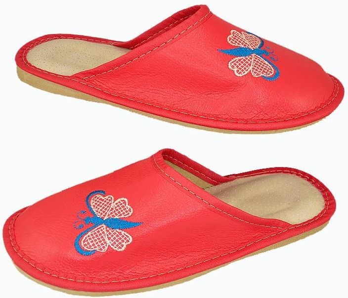 Kolorowe, pantofle wsuwane dla dzieci. Kapcie dla dzieci z krytymi palcami w kolorze czerwonym z haftowaną aplikacją motylka. Wykonane ze skór naturalnych, wyprofilowane "noski" pod palce, dzięki czemu cała stopa idealnie wpasowuje się w profil kapcia nie ugniatając i doskonale trzymając się stopy. Wyłożone w całości skórzaną wyściółką oraz wkładką z wyprofilowaniem pod śródstopie. Całość wykończona lamówką, osadzone na elastycznym gumowym spodzie w kolorze ciemnoszarym. Tęgość standardowa "G" dla stóp o każdej przeciętnej szerokości oraz wysokości podbicia. Dostępne rozmiary od 28 do 34, prosimy zwrócić uwagę na długość wkładki wewnętrznej i dokładnie wymierzyć przed zakupem.