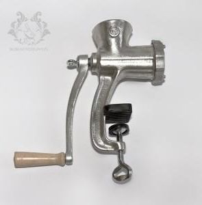 Ręczna maszynka do mielenia mięsa rozmiar 5 polska ALFA Klasyczna maszynka do mielenia mięsa nr 5 SPECYFIKACJA: Korpus - wykonany z jednolitego odlewu żeliwnego Rączka - żeliwna zakończona drewnianym uchwytem Klasyczna maszynka do mielenia mięsa wykonana z odlewu żeliwnego, rączka z drewnianym uchwytem. Produkt polski "ALFA", maszynka nr 5 Maszynka wyposażona jest w nóż o czterech ostrzach oraz sito do mielenia średnica otworów 4 mm. Klasyczna maszynka do mielenia mięsa nr 5 PRZEZNACZENIE: Mielenie mięsa: wieprzowego, drobiowego oraz wołowego. Maszynka posiada możliwość wymiany sitek na inne o różnych wielkościach otworów. Mięso przeznaczone do mielenia należy dokładnie oczyścić z kości, a następnie pokroić wzdłuż na małe kawałki. Słoninę należy pokroić podobnie jak mięso. Pokrojone kawałki należy stopniowo wkładać przez kielich do komory maszynki., kręcąc jednocześnie korbą, aby wprawić ślimak i nóż w ruch obrotowy. Nadziewanie kiełbas: opcjonalnie można do maszynki dokupić lejki do nadziewania mięsa w osłonki naturalne lub sztuczne. Dodatkowe sitka i lejki dostępne są na naszych innych aukcjach. Klasyczna maszynka do mielenia mięsa nr 5 PRZEZNACZENIE: Na całość maszynki składają się (wykonane z żeliwa i powleczone cyną): a.) Korpus b.) Ślimak c.) Nakrętka d.) Korba z drewnianą rączką e.) Śruba dociskowa części wykonane ze stali i następnie hartowane tj: g.) sitko z otworami fi 4 mm Oraz wykonana z tworzywa h.) tulejka