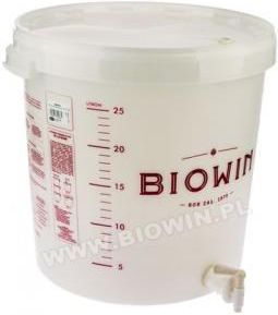 Pojemnik fermentacyjny z pokrywką i kranem 30 L - profesjonalny zestaw Biowin - termometry Na pojemnikach jest nadrukowana skala z pojemnością (z dwóch stron pojemnika) oraz cenne porady w przygotowaniu domowego wina, piwa oraz wędlin. Wytrzymały i elastyczny - pojemnik fermentacyjny wykonany jest z tworzywa przeznaczonego do kontaktu z żywnością, nie odkształca się, jest odporny na przebarwienia i nadaje się do fermentacji piwa lub wina. Uniwersalna konstrukcja - szeroka pokrywa pojemnika posiada otwór na rurkę fermentacyjną, samodzielna modyfikacja pojemnika pozwala również na montaż rurki kątowej. Korek w zestawie - w komplecie jest uniwersalny korek z zatyczką, aby można było stosować rurkę fermentacyjną lub w razie konieczności szczelnie zamknąć pojemnik. Łatwe zlewanie trunków - dołączony kran spustowy umożliwia całkowite zlanie piwa lub wina znad osadu. Umiejscowienie kranu nie przeszkadza w obracaniu pojemnika ani ustawianiu go na płaskich powierzchniach. Wygodna skala - z obu stron pojemnika znajduje się skala pojemności umożliwiająca kontrolowanie ilości nastawu, a także cenne porady dotyczące przygotowywania domowego wina, piwa oraz wędlin. Ekonomiczny kompletny zestaw w którym przygotujesz swoje ulubione domowe trunki. Pojemnik wykonany jest z białego tworzywa przeznaczonego do kontaktu z żywnością, odpornego na odkształcenia i przebarwienia, nieemitującego do nastawu trujących barwników. Pokrywa z otworem oraz uniwersalny korek z zatyczką, znajdujące się w zestawie, pozwalają na zaślepienie pojemnika lub umieszczenie rurki fermentacyjnej. Samodzielne wywiercenie dodatkowego otworu pozwala na zamontowanie rurki kątowej i prowadzenie fermentacji w kilku pojemnikach ustawionych na sobie. W celu otwarcia pojemnika należy pociągnąć za uchwyt, uchylić pokrywę, wsunąć w powstałą szczelinę płaski przedmiot, a następnie przeciągnąć go wokół brzegu pojemnika. Nie zaleca się czyszczenia pojemników szorstkimi myjkami - porysowana powierzchnia może stać się siedliskiem zakażeń. Montując kranik do pojemnika należy uszczelkę umieścić od zewnętrznej strony pojemnika. Zapewnia to pełną szczelność. Pojemnik i pokrywka wyprodukowane z polipropylenu, produkt wolny od BPA. Posmarowanie brzegów pojemnika wazeliną lub olejem jadalnym stanowi dodatkowe doszczelnienie. Maksymalna dozwolona temperatura wsadu: 85°C. Temperatura pojemników przed napełnieniem powinna wynosić minimum 5°C. Maksymalne stężenie alkoholu we wsadzie: 50%. W skład zestawu wchodzą: pojemnik fermentacyjny 30 L pokrywa z otworem uniwersalny korek z zatyczką kranik Wymiary produktu: pojemność 30 L wysokość pojemnika 36,9 cm wysokość pojemnika z pokrywą 37,1 cm Ø otworu w pokrywie 1,6 cm długość z uszami 40,3 cm szerokość / Ø zew. 37,9 cm Ø wew. pojemnika 35,5 cm otwór na wysokości 2 - 3 cm od dołu pojemnika Ø otworu w pojemniku 2,8 cm długość kranika po zamontowaniu 8 cm wysokość kranika 7,8 cm Ø zew. spustu kranika 1,1/1,2 cm