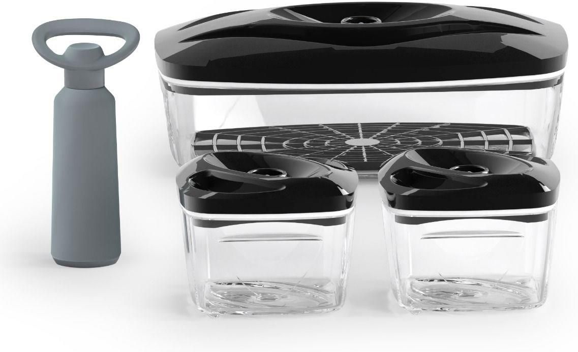 3 pojemniki hermetyczne na jedzenie SeeYoo ZESTAW czarny Zestaw trzech pojemników próżniowych jest uniwersalną propozycją, która sprawdzi się w każdej kuchni. Znacznie ułatwia marynowanie mięsa i ryb oraz przechowywanie wszystkich typów pokarmów, w tym wędlin, warzyw i owoców, kawy czy serów. …