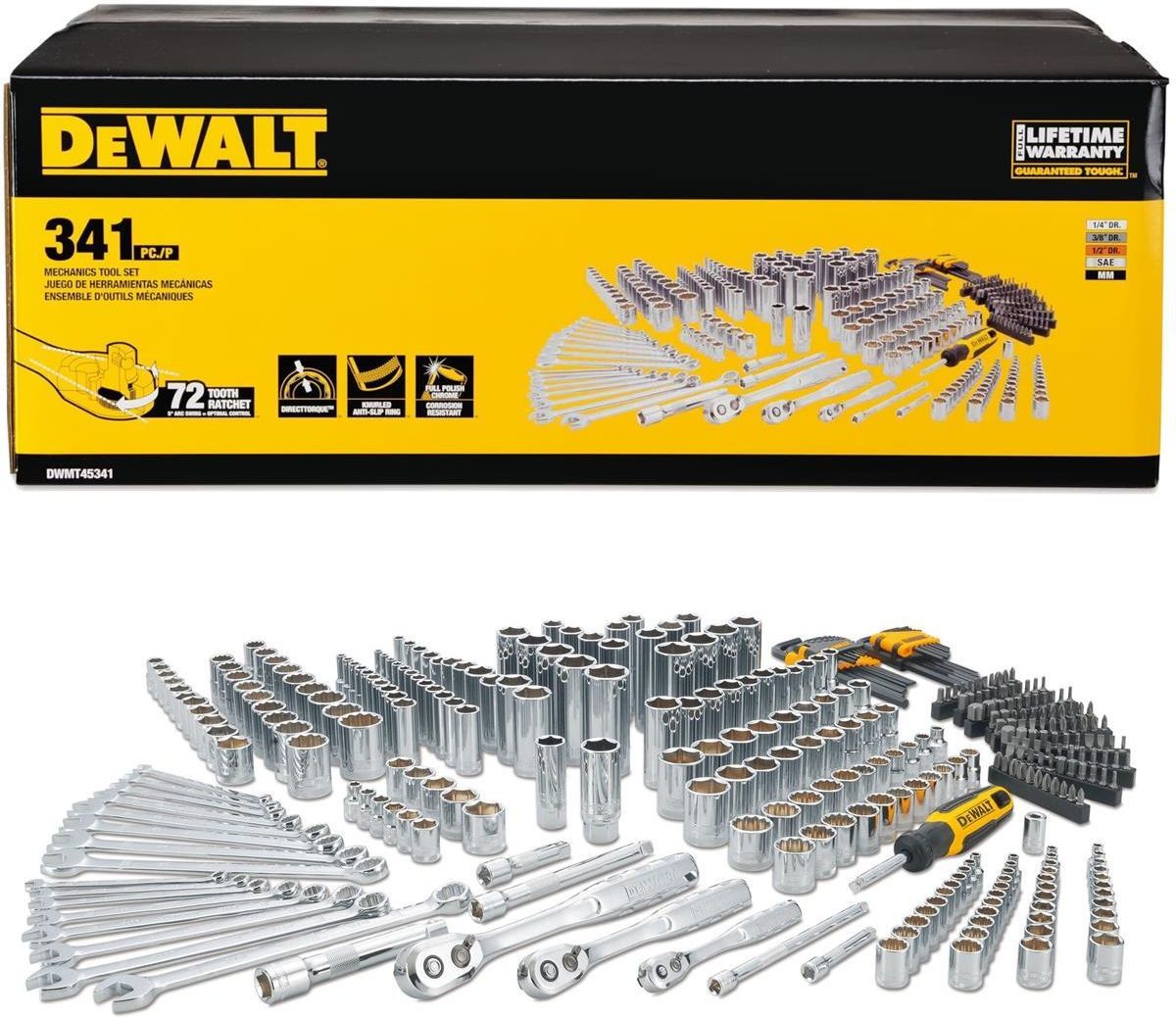 Zestaw mechaniczny 1/4", 3/8" i 1/2" na tackach DWMT45341-1 (3) grzechotki z główką gruszki: 1/4", 3/8", 1/2" (11) 1/4" nasadek 6-kątnych: (SAE) 5/32", 3/16", 7/32", 1/4", 9/32", 5/16", 11/32", 3/8", 7/16", 1/2", 9/16" (11) 1/4" nasadek 6-kątnych: (metryczne) 4 mm, 5 mm, 6 mm, 7 mm, 8 mm, 9 mm, 10 mm, 11 mm, 12 mm, 13 mm, 14 mm (10) głębokich nasadek 1/4" 6-kątnych: (SAE) 5/32", 3/16", 1/4", 9/32", 5/16", 11/32", 3/8", 7/16", 1/2", 9/16" (11) głębokich nasadek 1/4" 6-kątnych: (metryczne) 4 mm, 5 mm, 6 mm, 7 mm, 8 mm, 9 mm, 10 mm, 11 mm, 12 mm, 13 mm, 14 mm (11) 1/4" nasadek 12-kątnych: (SAE) 5/32", 3/16", 7/32", 1/4", 9/32", 5/16", 11/32", 3/8", 7/16", 1/2", 9/16" (11) 1/4" Nasadki 12-kątne: (metryczne) 4 mm, 5 mm, 6 mm, 7 mm, 8 mm, 9 mm, 10 mm, 11 mm, 12 mm, 13 mm, 14 mm (11) 3/8" nasadek 6-kątnych: (SAE) 1/4", 5/16", 3/8", 7/16", 1/2", 9/16", 5/8", 11/16", 3/4", 13/16", 7/8" (11) 3/8" nasadek 6-kątnych: (metryczne) 10 mm, 11 mm, 12 mm, 13 mm, 14 mm, 15 mm, 16 mm, 17 mm, 18 mm, 19 mm, 21 mm (11) 3/8" głębokich nasadek 6-kątnych: (SAE) 1/4", 5/16", 3/8", 7/16", 1/2", 9/16", 5/8", 11/16", 3/4", 13/16", 7/8" (11) głębokich nasadek 3/8 cala, 6-kątnych: (metryczne) 10 mm, 11 mm, 12 mm, 13 mm, 14 mm, 15 mm, 16 mm, 17 mm, 18 mm, 19 mm, 21 mm (11) 3/8" nasadek 12-kątnych: (SAE) 1/4", 5/16", 3/8", 7/16", 1/2", 9/16", 5/8", 11/16", 3/4", 13/16", 7/8" (11) 3/8" nasadek 12-kątnych: (metryczne) 10 mm, 11 mm, 12 mm, 13 mm, 14 mm, 15 mm, 16 mm, 17 mm, 18 mm, 19 mm, 21 mm (9) 1/2" nasadek 6-kątnych: (SAE) 1/2", 9/16", 5/8", 11/16", 3/4", 13/16", 7/8", 15/16", 1" (9) 1/2" Nasadki 6-kątne: (metryczne) 14 mm, 15 mm, 16 mm, 17 mm, 18 mm, 19 mm, 21 mm, 22 mm, 24 mm (9) 1/2" Głębokie nasadki 6-kątne: (SAE) 1/2", 9/16", 5/8", 11/16", 3/4", 13/16", 7/8", 15/16", 1" (9) 1/2" Głębokie nasadki 6-kątne: (metryczne) 14 mm, 15 mm, 16 mm, 17 mm, 18 mm, 19 mm, 21 mm, 22 mm, 24 mm (9) 1/2" nasadek 12-kątnych: (SAE) 1/2", 9/16", 5/8", 11/16", 3/4", 13/16", 7/8", 15/16", 1" (9) 1/2" nasadek 12-kątnych: (metryczne) 14 mm, 15 mm, 16 mm, 17 mm, 18 mm, 19 mm, 21 mm, 22 mm, 24 mm (8) kluczy płasko-oczkowych: (SAE) 1/4", 9/32", 5/16", 3/8", 7/16", 1/2", 9/16", 5/8" (8) klucze płasko-oczkowe: (metryczne) 6 mm, 7 mm, 8 mm, 10 mm, 12 mm, 13 mm, 14 mm, 15 mm (2) przedłużacze napędu 1/4": 3", 6" (2) przedłużacze napędu 3/8": 3", 6" (1) przedłużka napędu 1/2": 5" (2) nasadki do świec zapłonowych 3/8": 5/8", 13/16" (3) przeguby uniwersalne: napęd 1/4", napęd 3/8", napęd 1/2" (1) 99-częściowy zestaw bitów specjalnych (1) uchwyt obrotowy (2) 14-częściowe zestawy kluczy
