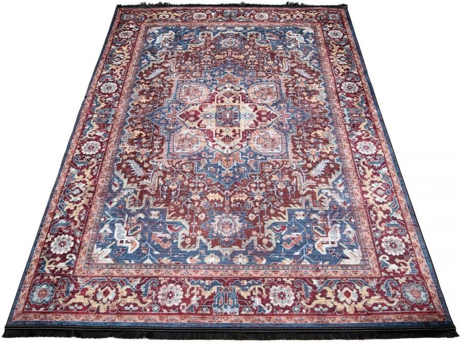 Dywan Wiktorius 00.38950 z kolekcji Wiktorius to prawdziwe dzieło sztuki, które przyciąga uwagę swoją bogatą kolorystyką i misternym wzorem. Dominującym kolorem dywanu jest głęboki, nasycony czerwony, który nadaje mu królewskiego charakteru. Wzór dywanu jest niezwykle złożony i pełen detali, z centralnym motywem przypominającym rozetę lub medalion, otoczonym przez mniejsze, powtarzające się elementy. Główny motyw jest obramowany przez niebieskie i granatowe odcienie, które kontrastują z ciepłym bordo, tworząc harmonijną kompozycję. Dodatkowe akcenty w postaci beżowych, kremowych i różowych tonów dodają dywanowi delikatności i elegancji. Brzegi dywanu są ozdobione frędzlami, co dodaje mu tradycyjnego, rękodzielniczego wyglądu. Wzór dywanu nawiązuje do klasycznych, perskich motywów, co czyni go idealnym elementem dekoracyjnym dla wnętrz inspirowanych stylem orientalnym lub vintage. Jego kształt jest prostokątny, co sprawia, że doskonale wpasuje się zarówno w duże salony, jak i mniejsze przestrzenie. Jeśli chodzi o inspiracje aranżacyjne, dywan Wiktorius 00.38950 może stać się centralnym punktem salonu, na przykład pod niskim, drewnianym stołem otoczonym miękkimi, beżowymi fotelami. Ściany mogą być ozdobione obrazami w stylu retro, a na meblach mogą znaleźć się poduszki w odcieniach niebieskiego i różowego, nawiązujące do kolorów dywanu. Lampa z abażurem w kolorze kości słoniowej dopełni całości, tworząc przytulną i elegancką przestrzeń. Ten dywan to doskonały wybór dla osób ceniących sobie tradycję, elegancję i sztukę w dekoracji wnętrz. Jego unikalny wzór i bogata kolorystyka sprawią, że każde pomieszczenie nabierze wyjątkowego charakteru. Wiktorius 00.38950 spodoba się szczególnie miłośnikom klasycznych, orientalnych wzorów oraz tym, którzy szukają elementu, który nada ich wnętrzu wyrazistości i stylu. Zachęcamy do zakupu tego wyjątkowego dywanu, który z pewnością stanie się sercem Twojego domu. Dywan z kolekcji Wiktorius dostępny jest w wielu rozmiarach, które ułatwią dopasowanie dywanika do konkretnego pomieszczenia. Dywan z przepięknym orientalnym wzorem zachwyca swoją estetyką, ale również praktycznością. Idealna propozycja dla właścicieli czworonogów. Wykonany został z przędzy poliestrowej, która jest niezwykle wytrzymała oraz odporna na ścieranie i blaknięcie kolorów. Dywan wykonany został metodą nadruku cyfrowego. Spód został pokryty antypoślizgową powłoką, dzięki czemu produkt z tej serii doskonale przylega do podłoża. Zdecydowanym atutem jest to, że dywan nadaje się do prania, co sprawia że dywany będą cieszyć się znakomitym wyglądem przez bardzo długi czas użytkowania.
