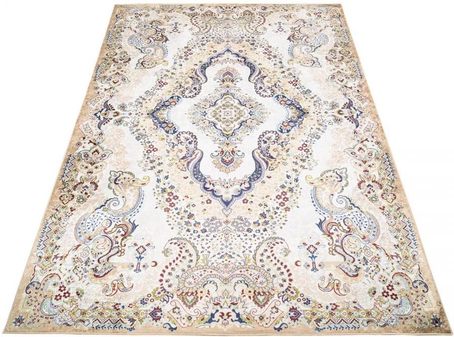 Dywan Wiktorius 00.42420 z kolekcji Wiktorius to prawdziwe dzieło sztuki, które zachwyca swoim eleganckim wzorem i subtelną kolorystyką. Dominującym kolorem dywanu jest delikatny beż, który tworzy tło dla bogatego, orientalnego wzoru. Wzór ten jest niezwykle złożony i składa się z wielu elementów, które przyciągają wzrok. Centralnym motywem jest duży, romboidalny medalion, otoczony misternie wykonanymi ornamentami. Wewnątrz medalionu można dostrzec symetryczne, kwiatowe motywy oraz geometryczne kształty, które nadają dywanowi klasycznego, a zarazem nowoczesnego charakteru. Dodatkowe kolory, takie jak granat, bordo, złoto i różne odcienie brązu, dodają głębi i kontrastu, sprawiając, że dywan jest pełen życia i dynamiki. Kształt dywanu jest prostokątny, a jego brzegi są wykończone delikatnym frędzlem, co dodaje mu tradycyjnego uroku. Inspiracją do urządzenia wnętrza z dywanem Wiktorius 00.42420 może być połączenie klasyki z nowoczesnością. Wyobraź sobie przestronny salon z wysokimi sufitami, gdzie dywan ten jest centralnym punktem aranżacji. Ściany mogą być pomalowane w neutralnych odcieniach, np. w delikatnym szarym lub kremowym, co podkreśli kolory dywanu. Meble mogą być zarówno klasyczne, jak i współczesne – elegancka sofa w odcieniach beżu lub szarości, połączona z drewnianymi meblami o prostych liniach, stworzy harmonijną przestrzeń. Dodatki w postaci poduszek w kolorach granatu i złota, a także designerskie lampy z metalowymi akcentami, dodadzą wnętrzu charakteru. Rośliny doniczkowe w dużych, ceramicznych donicach mogą wprowadzić odrobinę natury, łagodząc bogactwo wzorów dywanu. Dywan Wiktorius 00.42420 to idealny wybór dla osób ceniących sobie elegancję i wyrafinowanie w swoim wnętrzu. Jego unikalny wzór i kolorystyka sprawiają, że będzie on doskonałym dodatkiem do salonów, sypialni czy nawet gabinetów, gdzie każdy detal ma znaczenie. Jeśli szukasz dywanu, który nie tylko ozdobi Twoje wnętrze, ale również stanie się jego sercem, to Wiktorius 00.42420 jest właśnie dla Ciebie. Zachwyci on miłośników klasyki z nutą nowoczesności, a także tych, którzy cenią sobie unikalne, artystyczne akcenty w swoim domu. Nie czekaj, by dodać swojej przestrzeni tego wyjątkowego charakteru! Dywan z kolekcji Wiktorius dostępny jest w wielu rozmiarach, które ułatwią dopasowanie dywanika do konkretnego pomieszczenia. Dywan z przepięknym orientalnym wzorem zachwyca swoją estetyką, ale również praktycznością. Idealna propozycja dla właścicieli czworonogów. Wykonany został z przędzy poliestrowej, która jest niezwykle wytrzymała oraz odporna na ścieranie i blaknięcie kolorów. Dywan wykonany został metodą nadruku cyfrowego. Spód został pokryty antypoślizgową powłoką, dzięki czemu produkt z tej serii doskonale przylega do podłoża. Zdecydowanym atutem jest to, że dywan nadaje się do prania, co sprawia że dywany będą cieszyć się znakomitym wyglądem przez bardzo długi czas użytkowania.