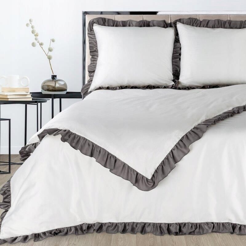 Elegancki biały komplet pościeli satynowej ELIZA wyprodukowany przez firmę Eurofirany. Wykonano go z wysokiej jakości satyny bawełnianej z dodatkiem poliestru, dzięki czemu pościel jest bardziej wytrzymała, sprężysta i aksamitna w dotyku. Prezentowana kolekcja pościeli została zaprojektowana według najnowszych światowych trendów. Kupując ją możesz więc być pewien, że wystrój Twojej sypialni będzie modny i elegancki. Biały komplet pościel, ozdobiony falbankąw stalowym kolorze na poduszkach i poszwie, prezentuje się niezwykle efektownie, a kontrastowa falbana przełamuje monotonię bieli, i nadaje całości wyjątkowego charakteru. W skład kompletu wchodzą: poszwa na kołdrę: 160 x 200 cm - 1 szt. poszewki na poduszki: 70 x 80 cm - 2 szt. Producent: Eurofirany Rozmiar poszwy na kołdrę: 160x200 cm Skład surowcowy: 100% satyna bawełna Sposób zapięcia: zamek błyskawiczny Kolor: biały, stalowy Gramatura: 125 GSM Skład: 55% bawełna, 45% poliester