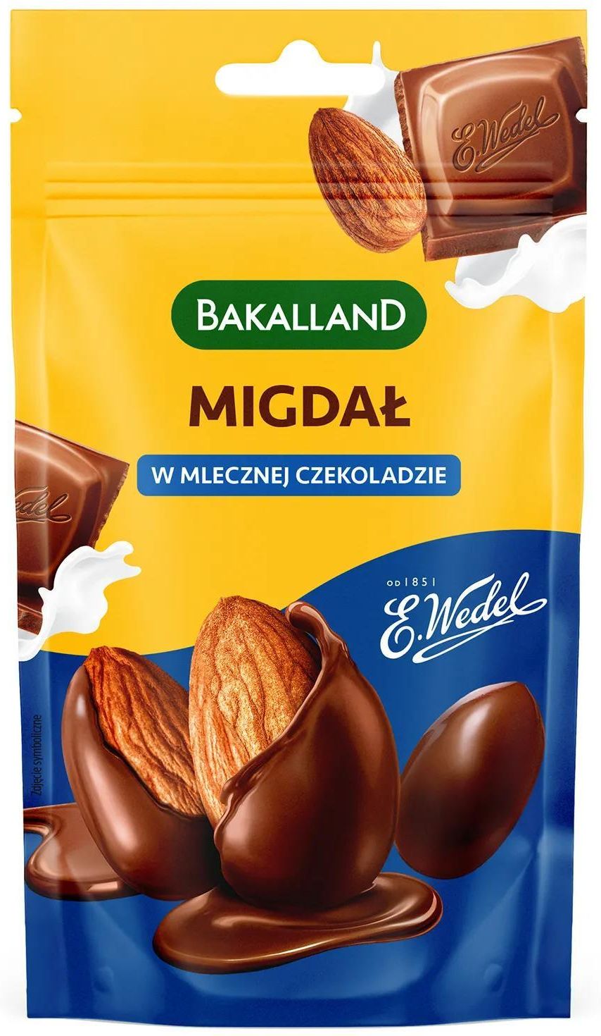 Bakalland Migdały w mlecznej czekoladzie 75g Bakalland Migdały w mlecznej czekoladzie 75g najważniejsze właściwości wyjątkowe połączenie chrupkości i słodyczy kremowa mleczna czekolada bez sztucznych konserwantów idealny wybór dla dzieci i dorosłych wysoka jakość składników Bakalland Migdały w Mlecznej Czekoladzie 75g to pyszna kombinacja chrupiących migdałów i delikatnej, kremowej czekolady, która zachwyci każdego miłośnika słodkich przekąsek. Każdy kawałek migdała otulony jest warstwą aksamitnej mlecznej czekolady, tworząc harmonijną całość, która rozpływa się w ustach. Produkt powstał na bazie starannie wyselekcjonowanych składników, dzięki czemu sprosta oczekiwaniom nawet najbardziej wymagających smakoszy. Jest on ciekawą alternatywą dla tradycyjnych przekąsek, po którą chętnie sięgają zarówno dzieci, jak i dorośli. 75 g to porcja, która w pełni zaspokoi głód lub ochotę na coś słodkiego. Dzięki wygodnemu opakowaniu produkt można zabrać ze sobą do szkoły, do pracy, w podróż lub na piknik. Orzechy dobrze sprawdzą się jako samodzielna przekąska oraz dodatek do innych przysmaków, np. owsianki lub ciasta. Podsumowując, Bakalland Migdały w Mlecznej Czekoladzie 75g to połączenie starannie wyselekcjonowanych migdałów i aksamitnej mlecznej czekolady, które wspólnie tworzą wyjątkową przekąskę. Jest to idealny wybór na chwilę relaksu, zapewniający wyjątkowe doznania smakowe. Składniki Składnik - 100 g (%RWS) Wartość energetyczna - 2408 kJ / 580 kcal (29 %) Tłuszcz - 43 g (61 %) - w tym kwasy tłuszczowe nasycone - 12 g (60 %) Węglowodany - 30 g (12 %) - w tym cukry - 27 g (30 %) Błonnik - 8,3 g (-) Białko - 13 g (26 %) Sól - 0,08 g (1 %) Czekolada mleczna 50% (cukier, tłuszcz kakaowy, mleko w proszku pełne, miazga kakaowa, tłuszcz mleczny, serwatka w proszku (z mleka), emulgatory: lecytyny (soja) i E 476, aromat), migdały łuskane prażone 49%, substancja glazurująca: guma arabska. Czekolada mleczna: masa kakaowa minimum 35%, masa mleczna minimum 18% Sposób użycia Produkt gotowy do spożycia. Przechowywanie Przechowywać w pomieszczeniach czystych, suchych i przewiewnych, bez obcych zapachów, szkodników i ich pozostałości. Podmiot odpowiedzialny: MIPAMA E.Z.Szafarz sp.j. ul. Rogatka 7a, 62-860 Opatówek NIP: 9680878320 SKU: 5900749002400