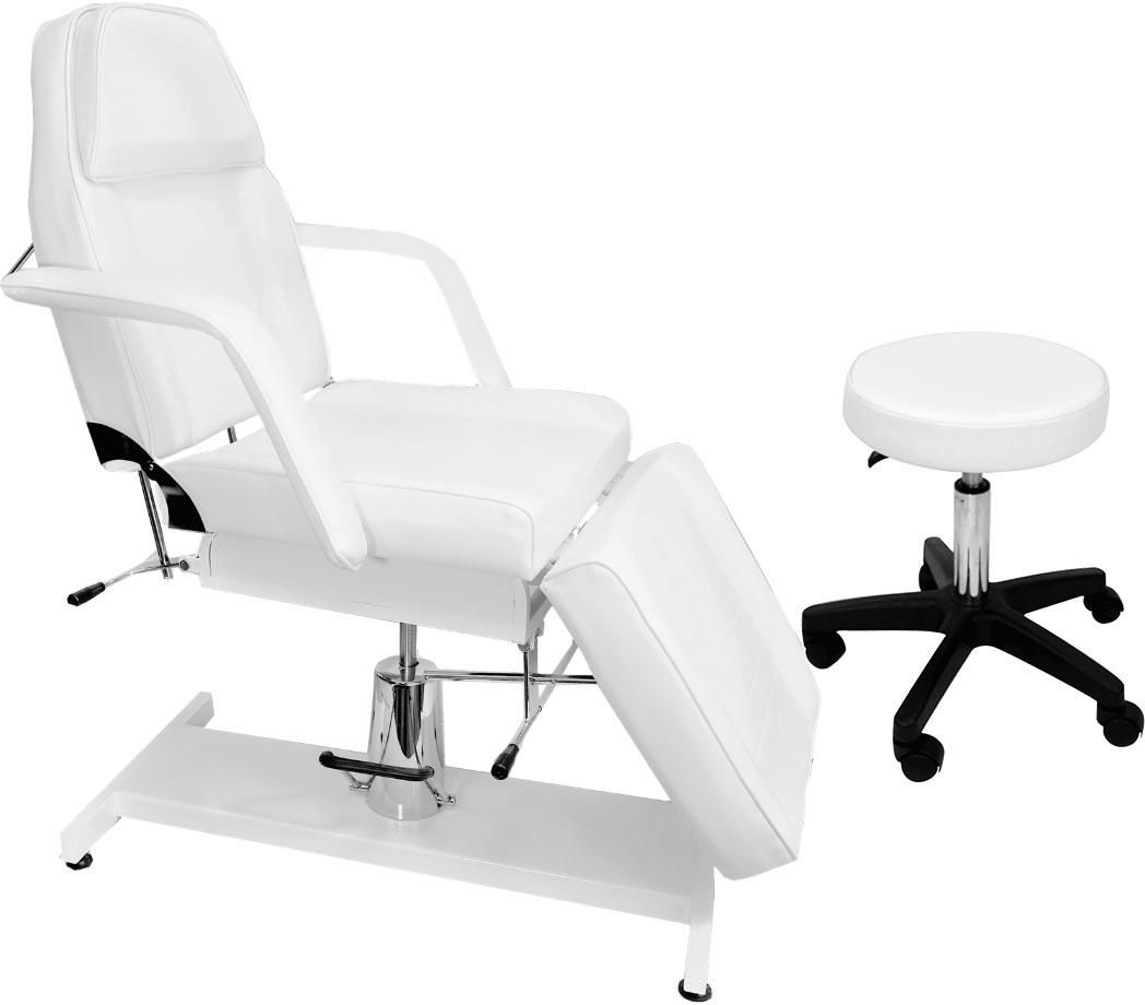 Fotel kosmetyczny hydrauliczny CLASSIC Fotel kosmetyczny hydrauliczny z funkcją obrotową z blokadą. Fotel posiada zdejmowany podgłówek, który zaślepia otwór w zagłówku. Podłokietniki można zdemontować wedle potrzeb. Fotel wykonany jest z wysokogatunkowej eko-skóry, która jest łatwa w utrzymaniu czystości oraz odporna na wybrane środki do dezynfekcji. Siedzisko osadzone jest na stabilnej podstawie, która jest polakierowana. Regulacja wysokości odbywa się za pomocą bardzo precyzyjnego siłownika hydraulicznego, który również odpowiada za możliwość obracania fotela. Siłownik ma wbudowany system blokujący uniemożliwiający obracanie fotela po wybraniu odpowiedniego położenia. Oparcie oraz podnóżek posiada manualny, bardzo wygodny, system regulacji kąta pochylenia. Dzięki dużemu zakresowi regulacji pochylenia oparcia i podnóżka, można fotel ustawić w optymalny sposób dla prawidłowego i wygodnego wykonania zabiegu. Fotel jest doskonałym wyborem biorąc pod uwagę cenę, jakość wykonania oraz funkcjonalność. Elementy składowe: – fotel pakowany w dwa kartony – siedzisko wraz z oparciem i podnóżkiem – zagłówek z otworem i podgłówkiem, który zaślepia otwór – podłokietniki – komplet – siłownik hydrauliczny – dźwignia do siłownika – lakierowana podstawa ze stopkami Parametry techniczne: – waga 50 kg – długość po rozłożeniu 183 cm – szerokość z podłokietnikami 83 cm – szerokość bez podłokietników 63 cm – minimalna wysokość siedziska 58 cm – maksymalna wysokość siedziska 78 cm – podstawa długość 105cm szerokość 57cm Wymiary kartonów: karton o wymiarach 115 cm x 40 cm x 66 cm – waga 30 kg karton o wymiarach 97 cm x 68 cm x 44 cm – waga 20 kg Taboret kosmetyczny BASIC bez oparcia Wygodny i elegancki taboret bez oparcia z hydrauliczną regulacją wysokości. Dostępny w białym kolorze, wykonany z ekologicznej skóry, łatwo zmywalny. Posiada komfortowe siedzisko o średnicy 41 cm. Usytuowany na pięcioramiennej podstawie na kółkach. Zastosowanie: Pomocny w zabiegach pedicure, manicure, zabiegach na twarz. Parametry techniczne: – średnica siedziska: 34 cm – wysokość minimalna: 48 cm – wysokość maksymalna: 62 cm – waga: 5 kg Do czyszczenia fotela i taboretu nie stosować preparatów posiadających w składzie naftę, alkohol, amoniak lub inne środki żrące.