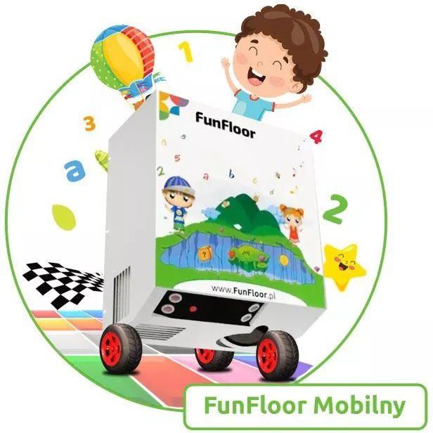 Interaktywna podłoga FunFloor Mobilny Odpowiadając na życzenia naszych klientów powstał specjalny FunFloor w wersji mobilnej. Można go zamontować na bezpiecznym stabilnym statywie z gumowymi kółkami albo przymocować na stałe do ściany. Jest to pierwszy produkt stworzony we współpracy z firmą Acer. Dzięki zastosowaniu szerokokątnego projektora obraz wielkości 270cm x 200cm uzyskujemy z wysokości 185cm. FunFloor Mobilny zawiera 80 gier, wyposażony jest w 3 pakiety gier FUN (50 gier), EDU (50 gier) + EKO (10 gier). Istnieje możliwość wzbogacenia urządzenia o dodakowe pakiety gier nawet do 300 oraz zamówienie pisaków interaktywnych, które również są obsługiwane w tej wersji. Pakiety gier FunFloor Mobilny zawiera 3 pakiety tematyczne, w których jest razem 110 gier: Pakiet Fun 50 – zróżnicowany zestaw gier zabawowo-sportowych, który pokazuje największe możliwości interaktywnej podłogi. Piłka nożna, łapanie pingwinów, odkrywanie skarbów pod piaskiem to doskonały przerywnik w nauce ale również główna atrakcja w salach zabaw. Pakiet EDU 50 – pakiet stworzony w oparciu o podstawę programową Ministra Edukacji Narodowej do nauki w przedszkolach. Tworząc ten pakiet położyliśmy nacisk na edukację najmłodszych i rozwój wszystkich podstawowych obszarów, od kształtowania umiejętności społecznych, naukę higieny, promocję zdrowia jak również poznawanie cyferek, literek, dźwięków aż po elementy geografii. Po za przedszkolami pakiet EDU jest używany bardzo często w klasach 1-3. Pakiet EKO 10 – pakiet Ekologia stworzony został aby edukować i zwiększać świadomość ekologiczną. Pakiet zawiera 10 gier związanych z segregacją, sprzątaniem i rozkładaniem się odpadów. Gry ekologiczne mają za zadanie zaszczepić nawyk dbania o naszą planetę. Stojak sprzedawany osobno!